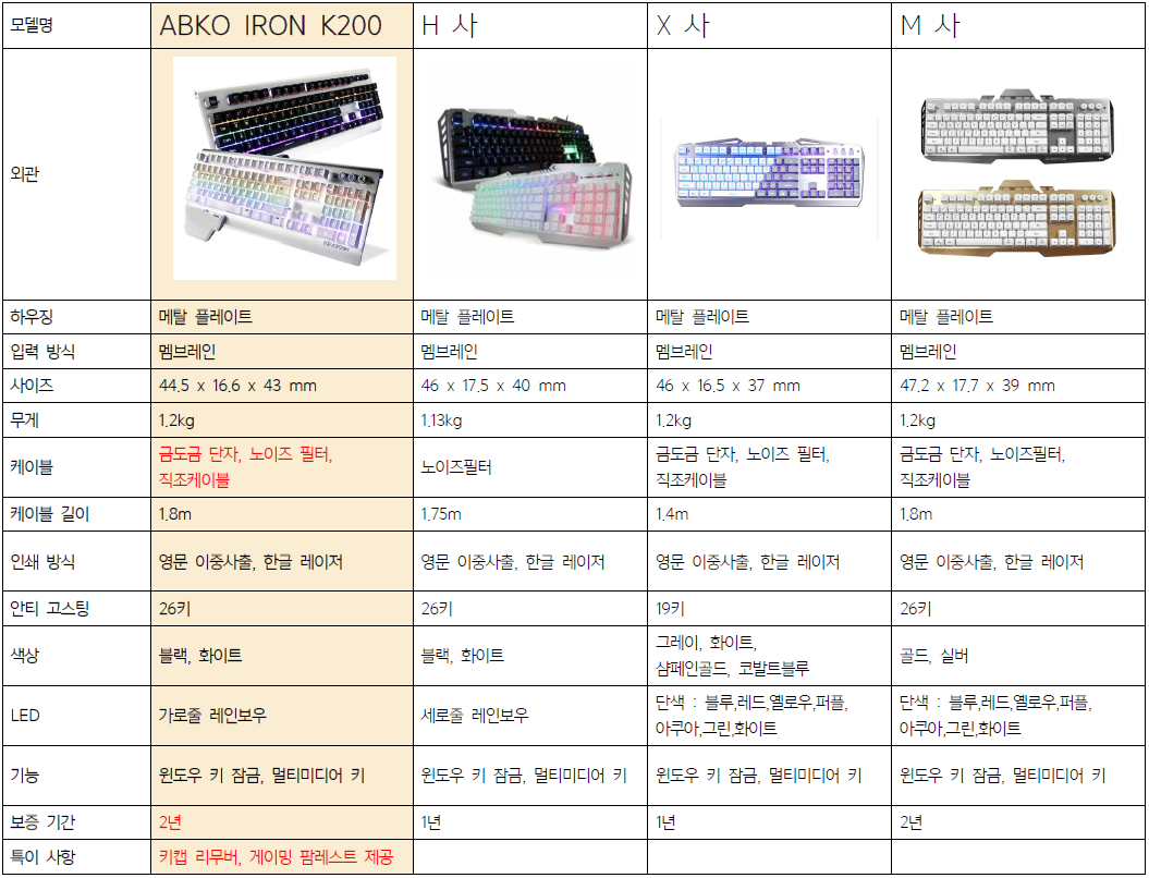 3. A/S : H 사, X 사의 키보드는 1년의 보증기간이지만 IRON K200의 2년의 보증 기간을 지원 하고 있습니다. 특히 PC방과 같이 키보드 사용이 끊임 없는 곳에서 2년 A/S는 큰 장점으로 다가 옵니다.