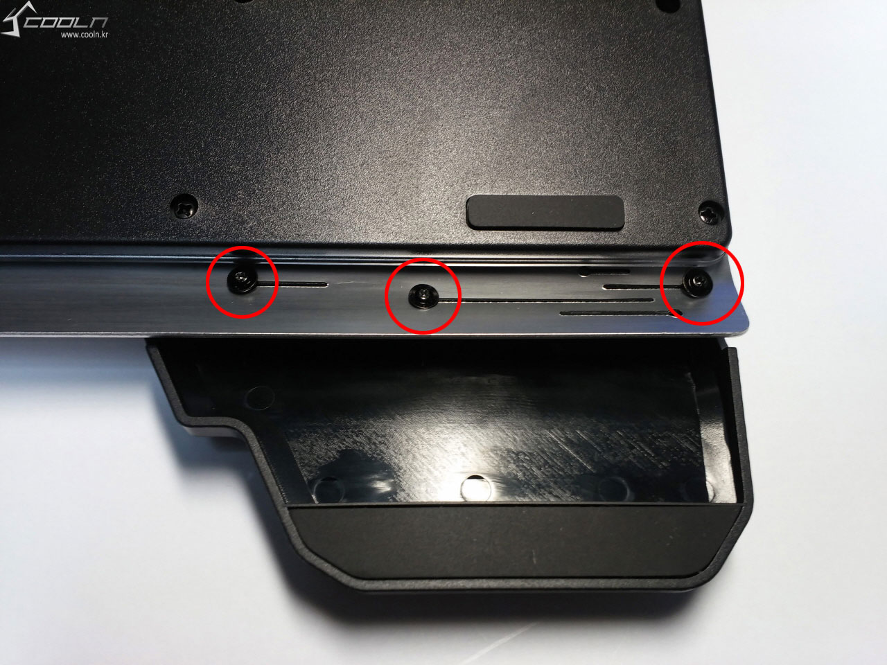 팜레스트 고정 부분 입니다. 여기서도 한가지 칭찬을 하고 싶은 부분인데 팜레스트를 사용하지 않았을 시에도 큰 위화감이 없도록 디자인 포인트를 잘 잡은 것 같습니다. 만약 고정용 구멍 3개만 덩그러니 있었다면 뭔가 어색했을 텐데,