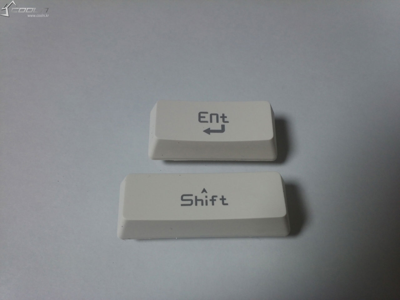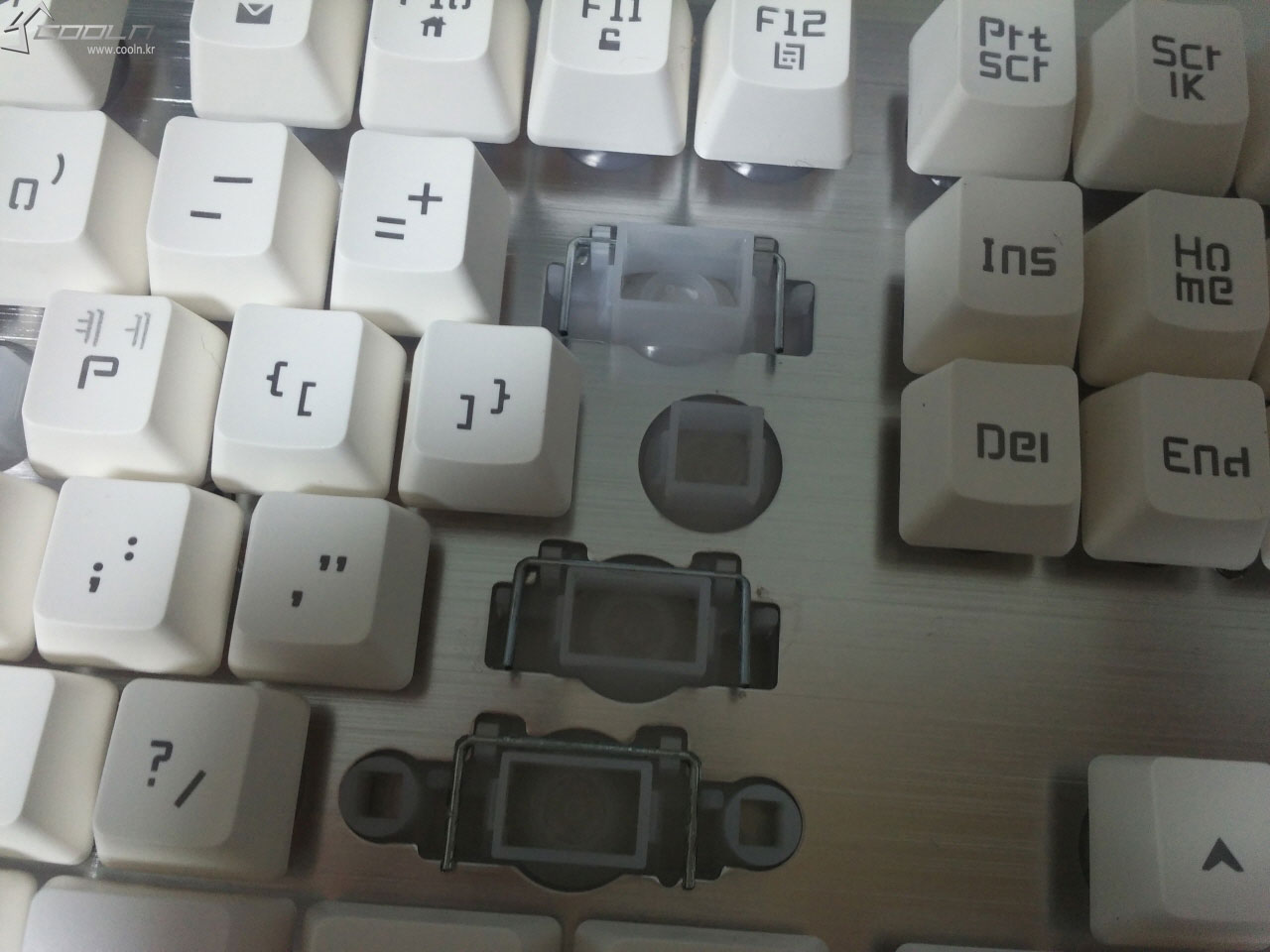 키캡의 모습입니다. LED 효과를 위해 한글 각인을 제외한 글자들은 모두 불투명 재질로 이중 사출이 되어 있고, 한글은 레이저 각인 입니다. 가장 최근에 리뷰한 A 사의 경쟁 제품은 우측 Shift만 스테빌라이저가 사용 되었었는데, 이 제품은 Enter 및 Backspace 등 1.5x 사이즈 이상의 키캡에는 모두 스테빌라이저가 들어가 있습니다.