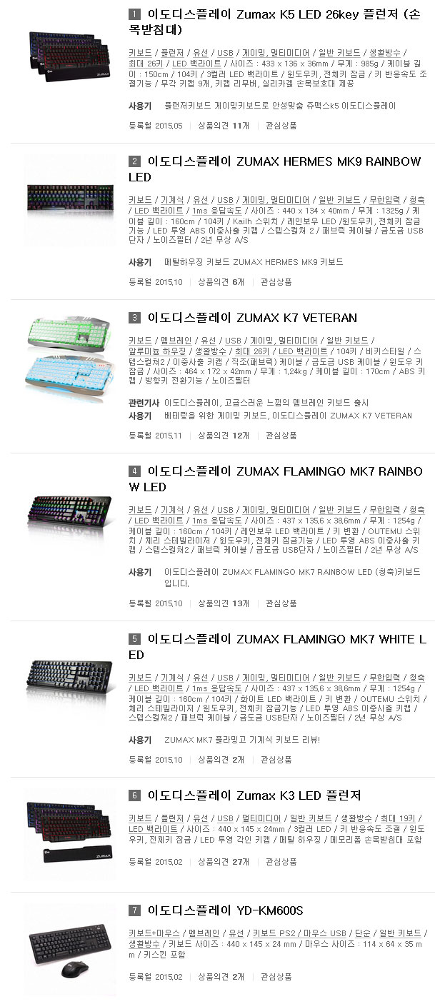이도디스플레이는 2015년 12월 현재, 아래와 같이 총 7개의 키보드 라인업을 가지고 있습니다.