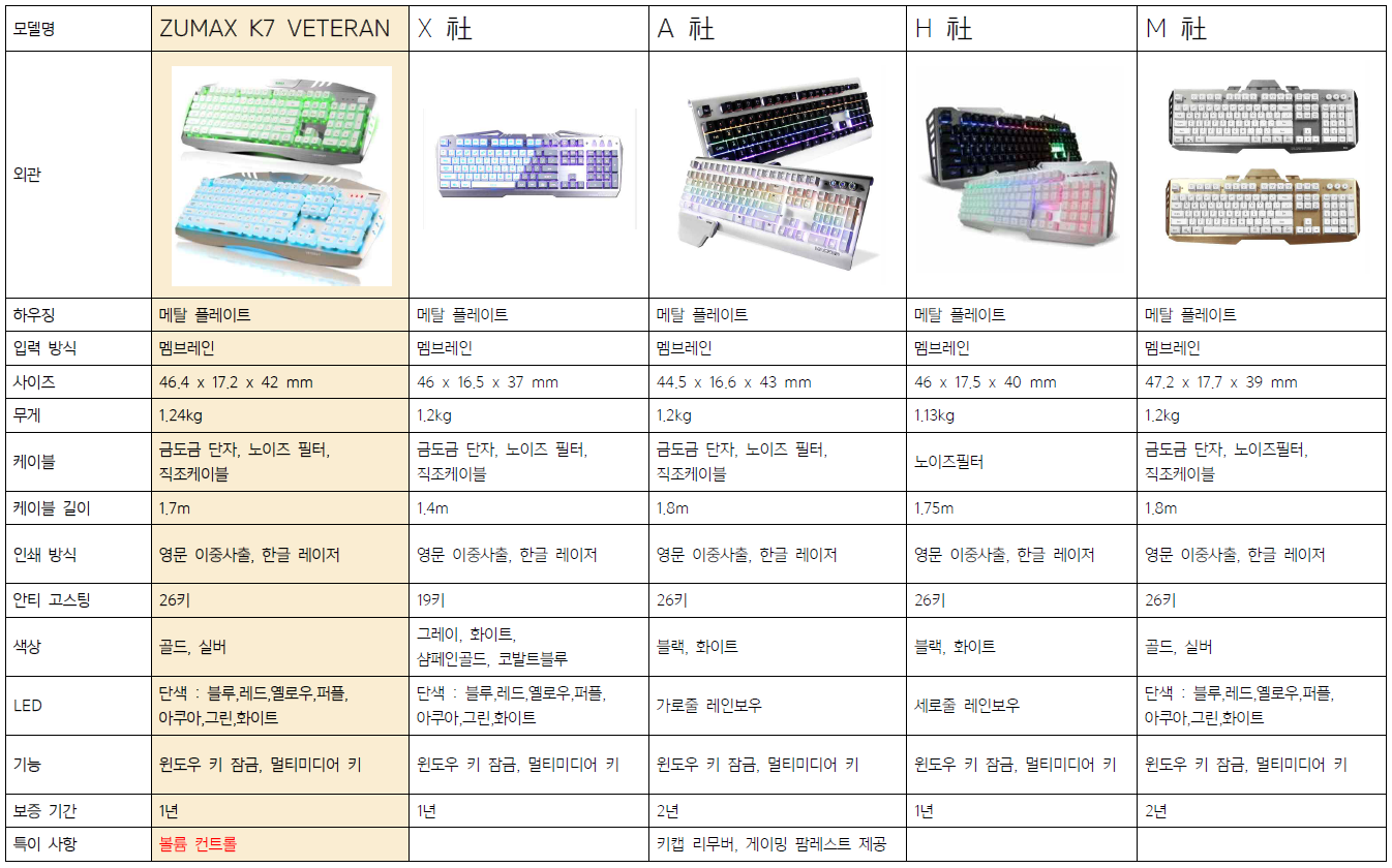 잘 아시겠지만 경쟁사의 비슷한 모델들이 많이 출시가 된 상태 입니다. 그 중에는 공교롭게도 제가 직접 구입한 제품도 있고, 최근에 필드 테스터로 사용해 본 제품도 있습니다. 제가 직접 사용해본 키보드는 ZUMAX K7 VETERAN을 포함하여 X, A, H 社의 키보드 입니다.
