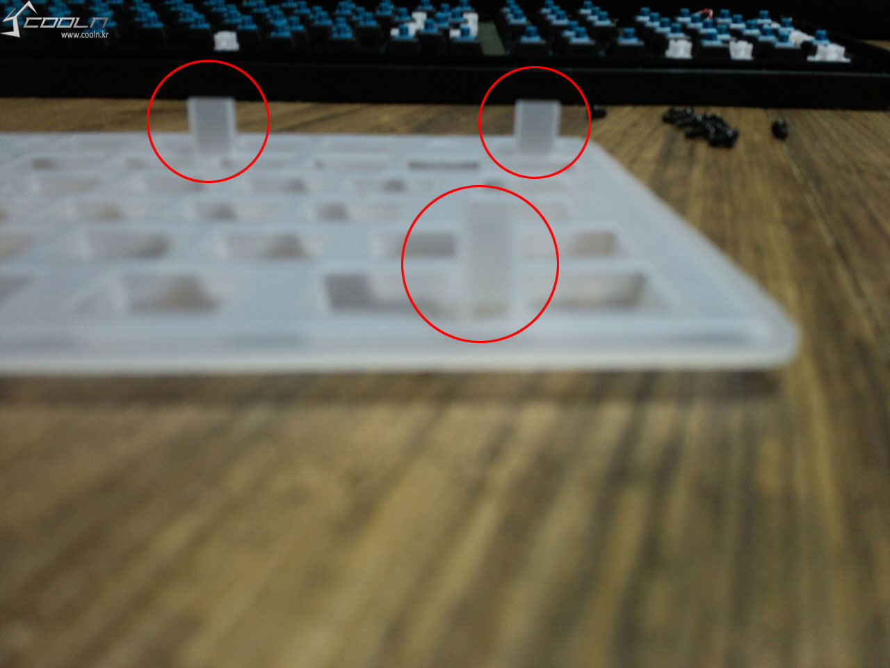 키캡을 제거 한 모습 입니다. 이 키보드의 가장 큰 특징인 방수 실리콘 패드를 볼 수 있습니다.