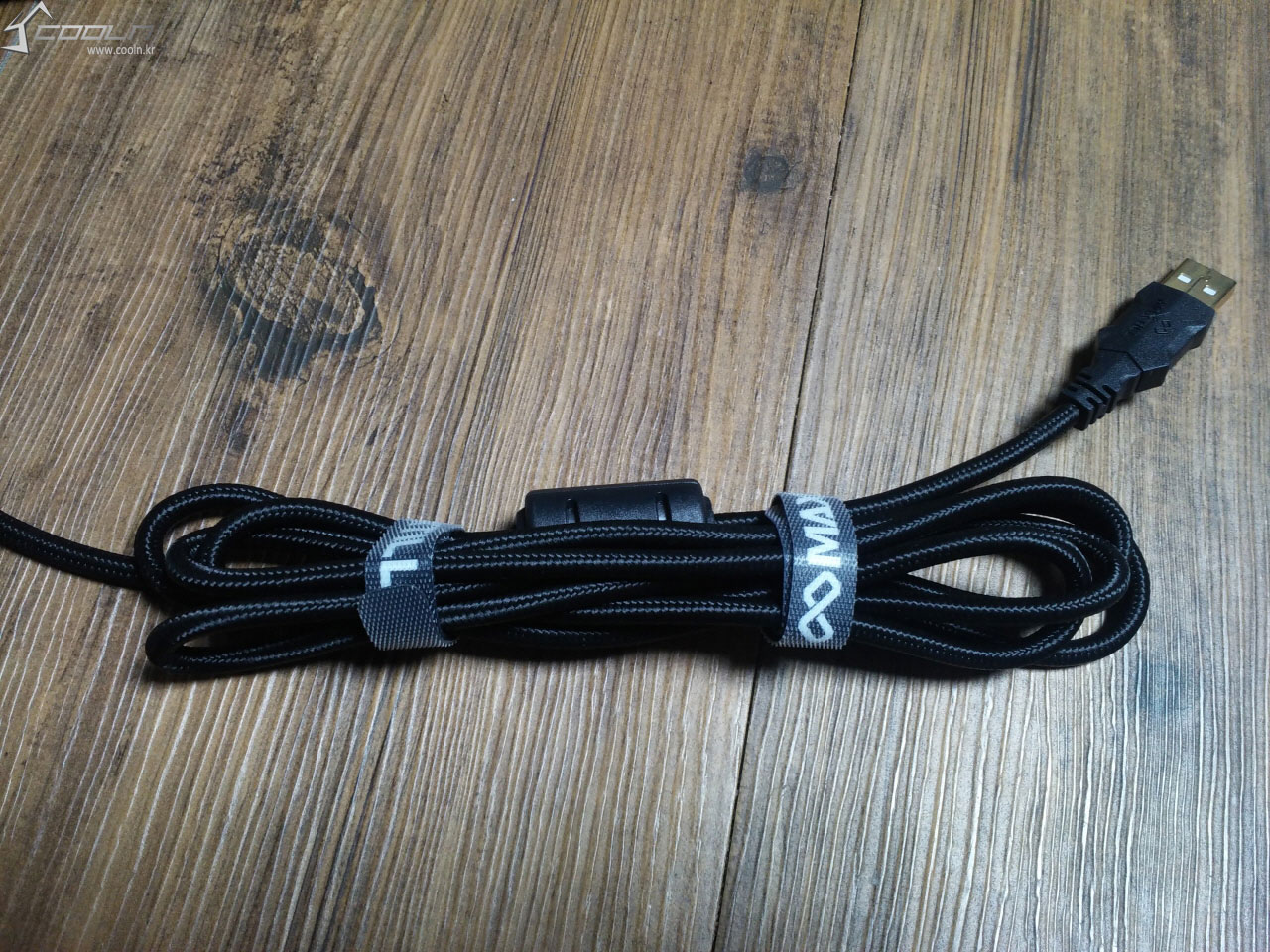 케이블 연결 부분과 케이블의 모습 입니다. 상당히 두꺼운 직조 케이블을 사용하고 있습니다. 노이즈 필터와 금도금 USB 단자를 사용 하였습니다. 특이 점으로는 케이블 정리용 벨크로 타이를 2개나 제공하고 있습니다.