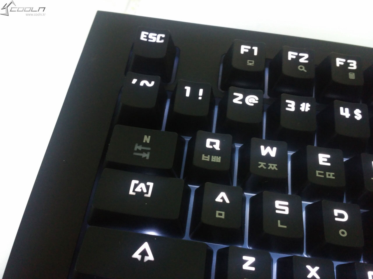 키캡은 이중 사출 방식으로, 영문은 LED 투과를 위해 불투명 재질로 되어 있으며, 한글은 레이저 각인이 되어 있습니다.