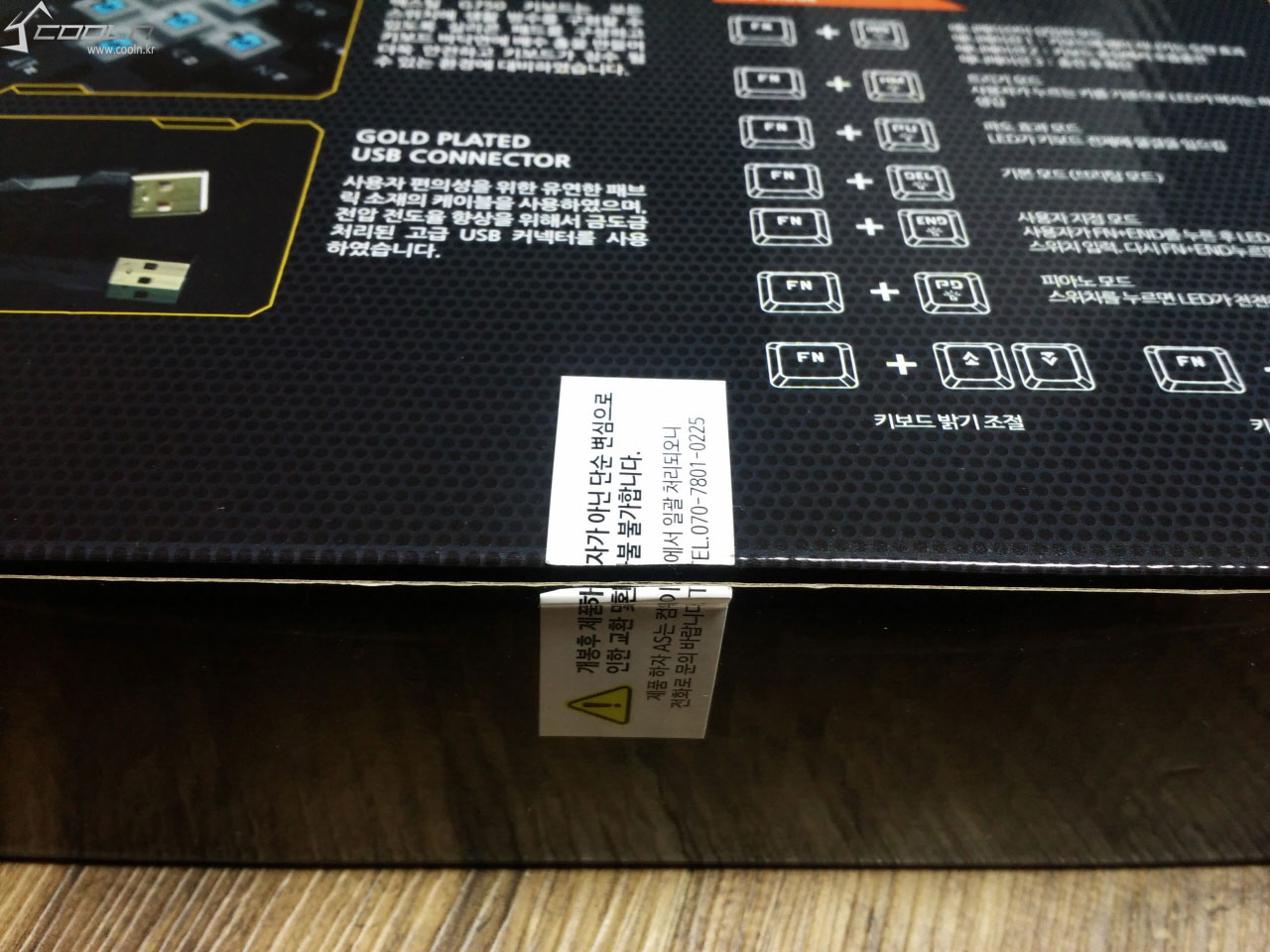 후면의 박스 디자인 입니다. 제품의 특징인 카일 스위치, LED 백라이트 모드, 방수 실리콘 패드, 금도금 커넥터에 대한 설명과 LED 모드 사용 시 조합하여야 하는 키에 대한 설명이 프린트 되어 있습니다.