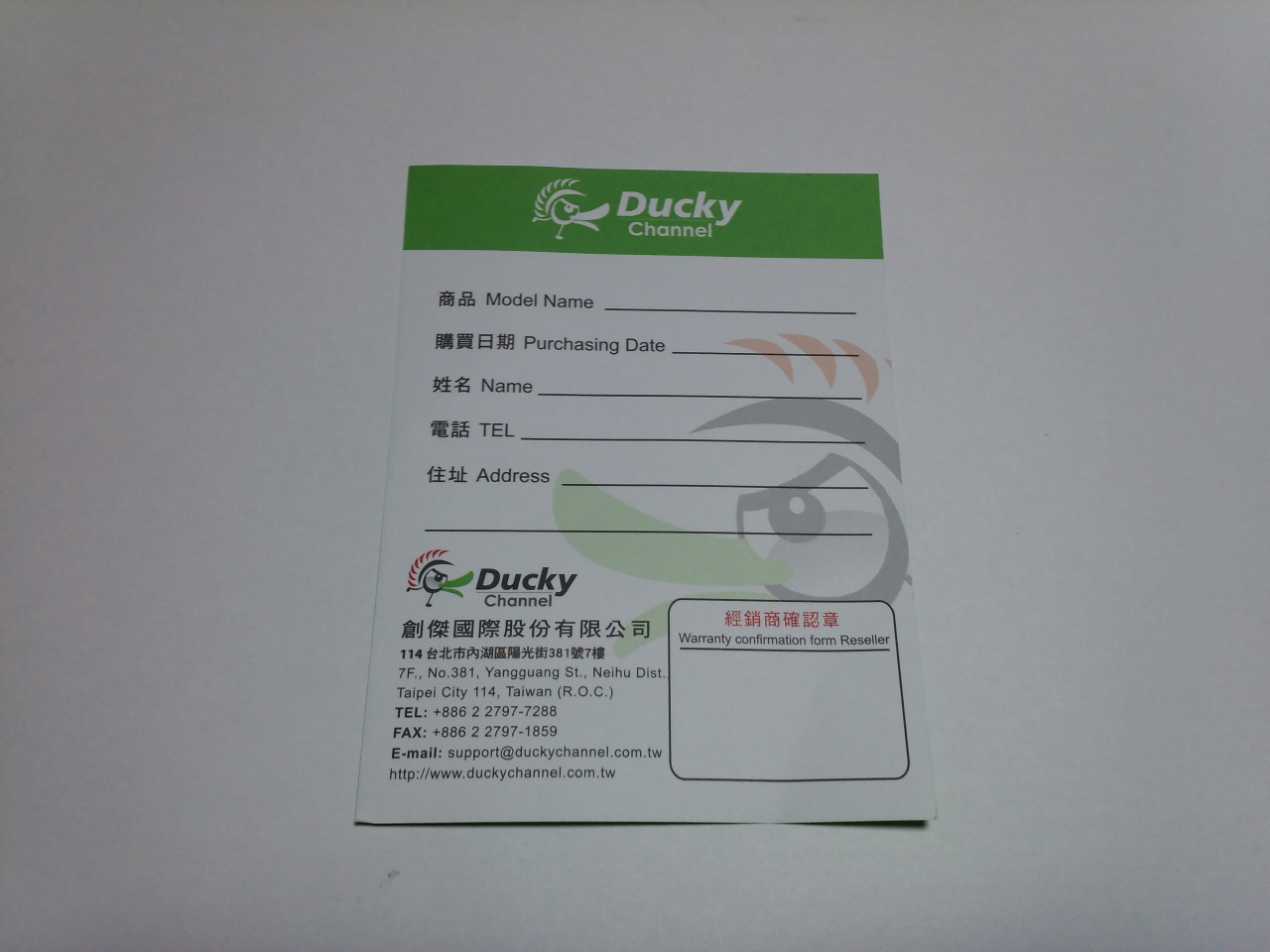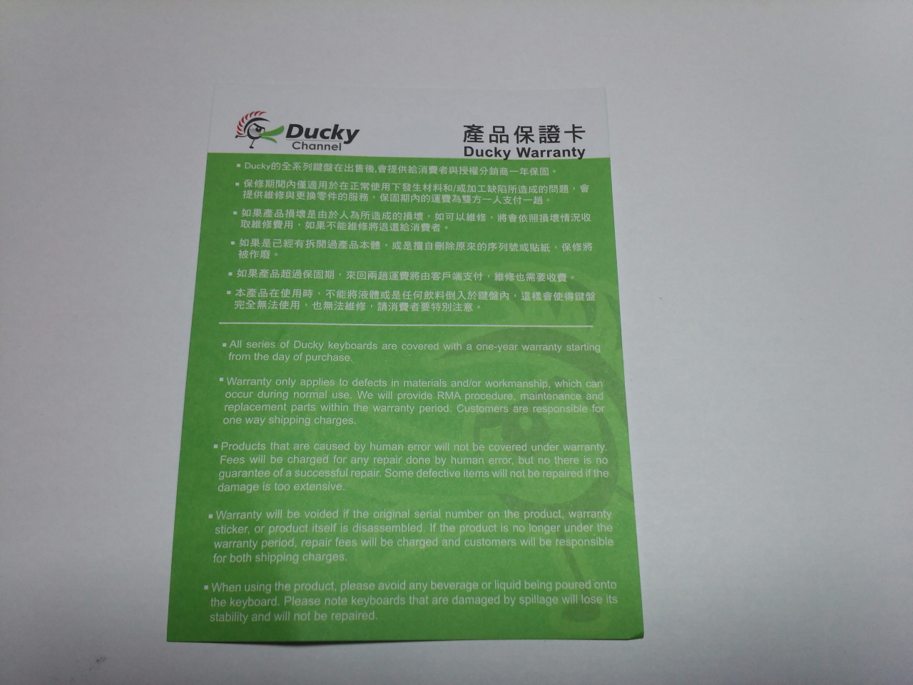 한장 짜리로 된 제품 보증서 입니다.