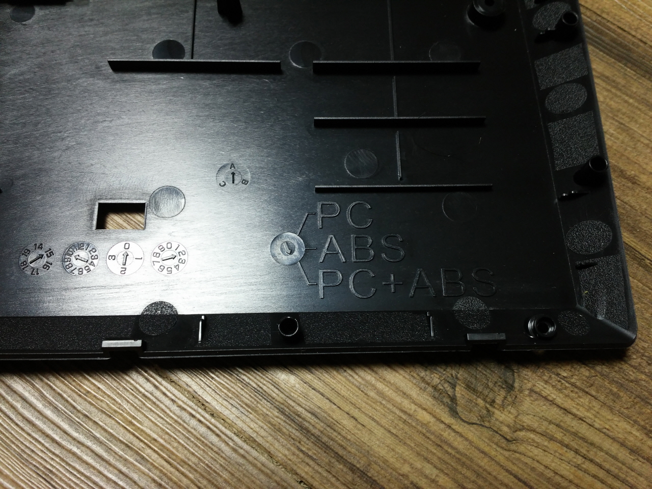 키보드 하판 플라스틱의 내부 모습 입니다. 제조날짜와 하우징의 재질을 알 수 있습니다.