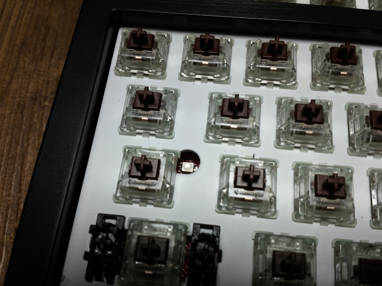 나사를 다 풀고 상판을 들어 내면 새하얀 보강판과 투명한 하우징의 체리의 RGB 스위치가 반겨 줍니다.