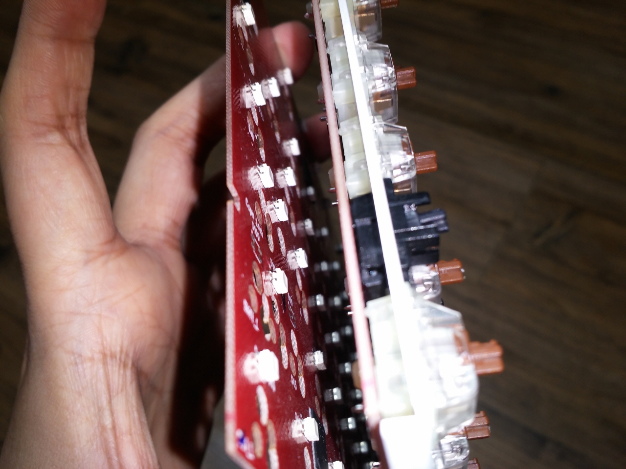 저 칩 LED들은 첫번째 기판에서 스위치 아래로 뚫린 구멍 부분에 위치하게 됩니다.