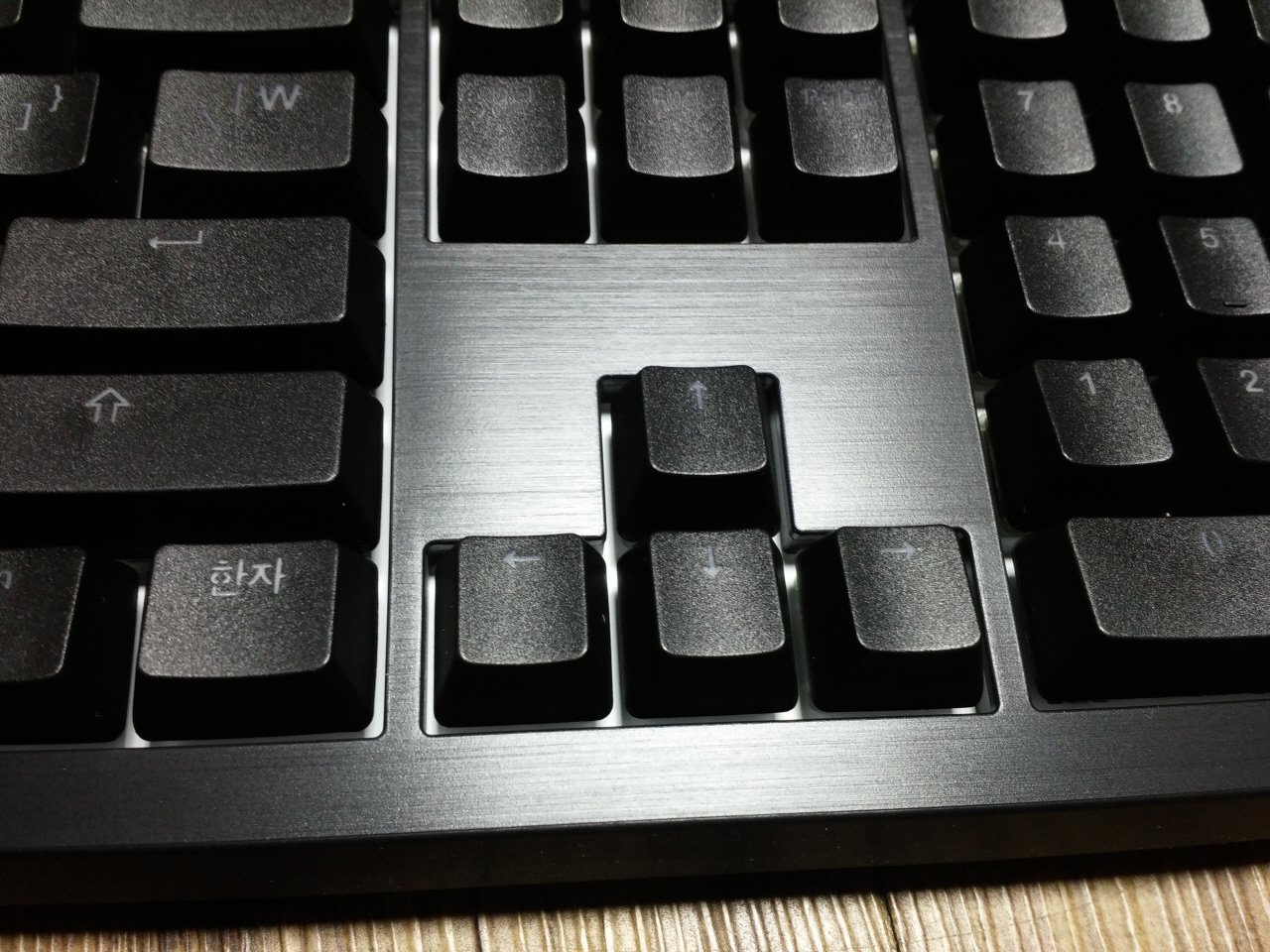 다소 지루했던 구성품 소개가 끝나고, 드디어 키보드를 꺼내 보았습니다. 맨 처음으로 눈에 띄는 것은 헤어라인이 들어간 상판 하우징의 모습이었습니다. 만져보기 전에는 금속의 차가움이 느껴질 것 같았는데, 막상 만져보니 플라스틱의 따뜻함이 느껴졌습니다. ^^;