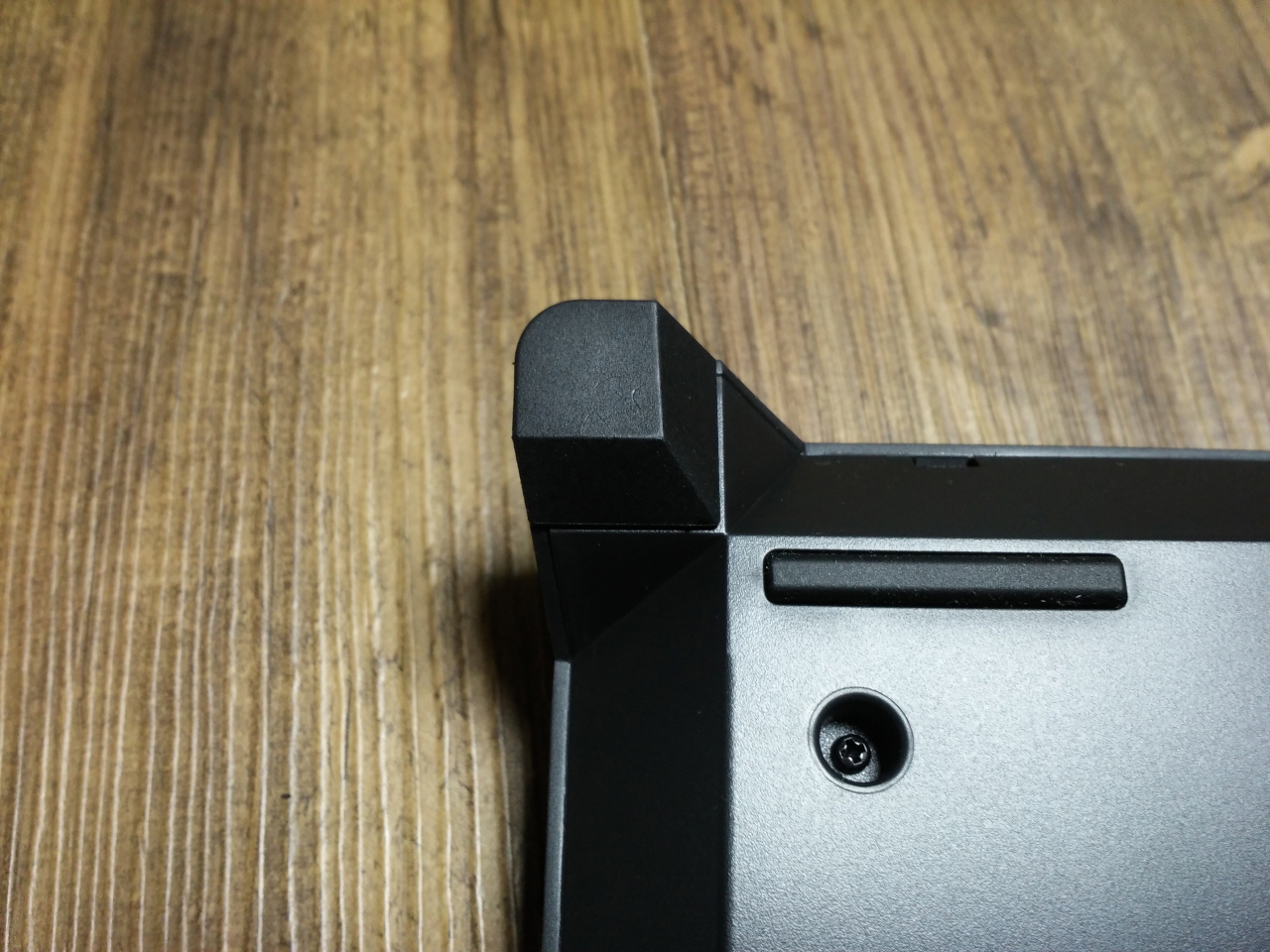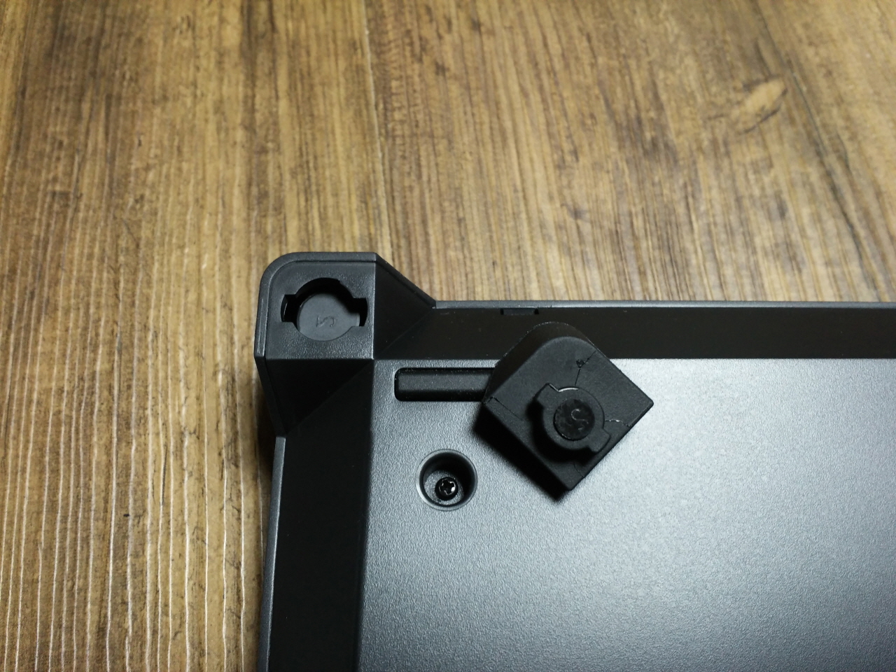 높이 조절 고무의 모습입니다. 90도로 꺾어서 탈착이 가능 합니다. 더키 샤인 4 부터 적용 되었는데, 개인적으로는 불편한 부분 중에 하나라고 느껴집니다. 조절 다리를 사용하지 않을 경우 키보드 본체에 따로 수납 공간 같은 것이 없기 때문에 분실에 조심하여야 할 것 같습니다.