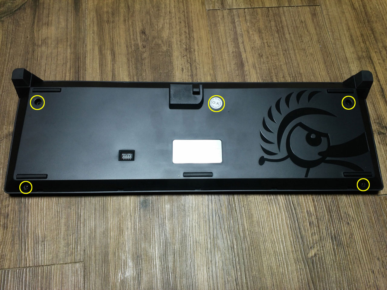 키보드의 하판 모습입니다. 우측에는 더키 채널의 로고 캐릭터가 큼지막하게 음각으로 새겨져 있습니다.