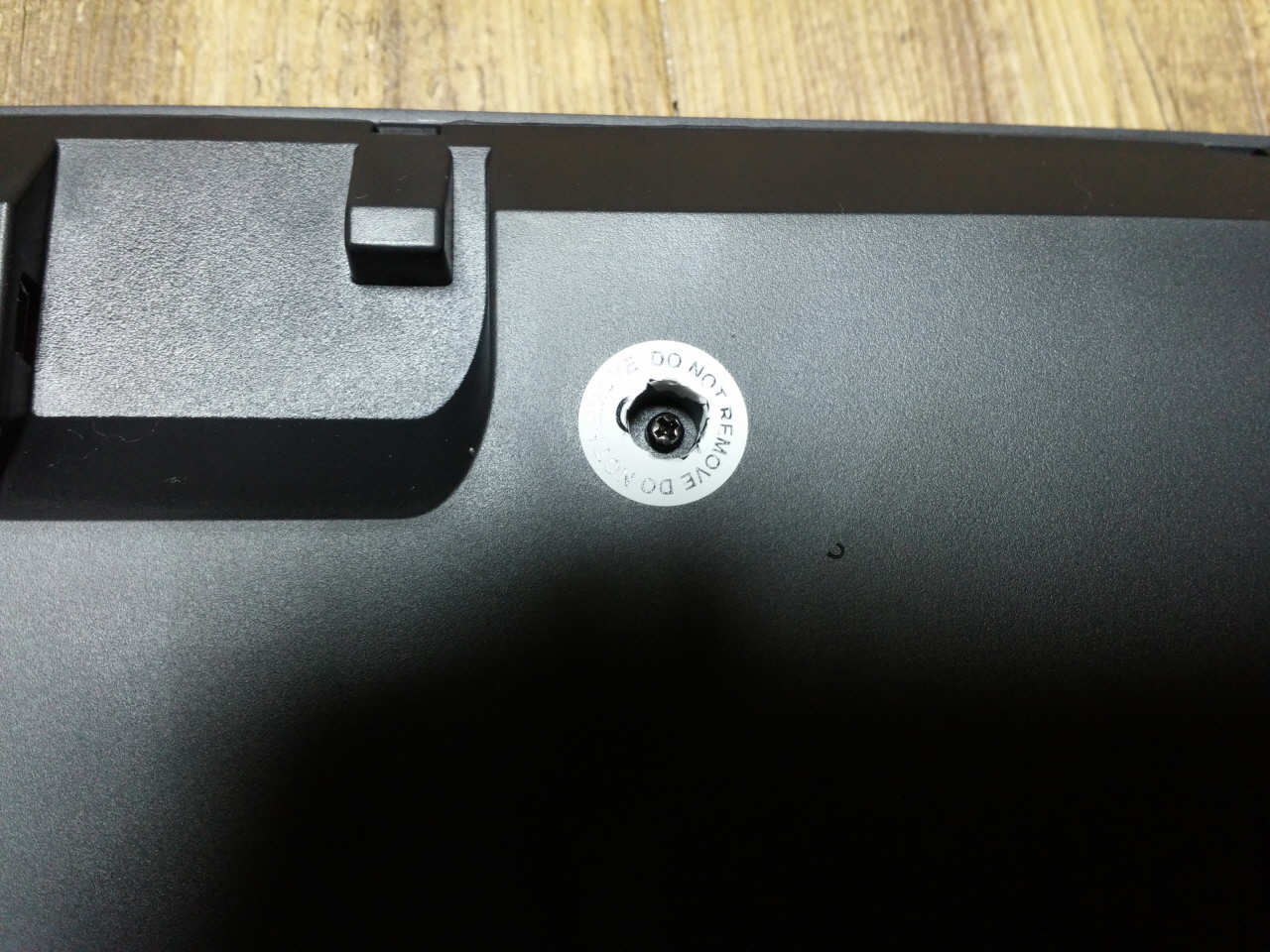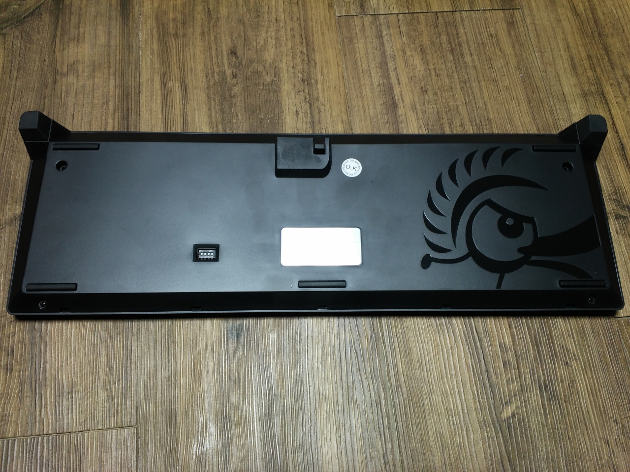 왼쪽에는 키 설정을 변경할 수 있는 딥스위치가 위치하고 있고, 가운데는 유광 재질의 라벨이 있습니다. 그 위로는 A/S를 위해서 절대 훼손해서는 안되는 봉인 씰과 탈착식 USB 케이블 연결 단자가 있습니다.