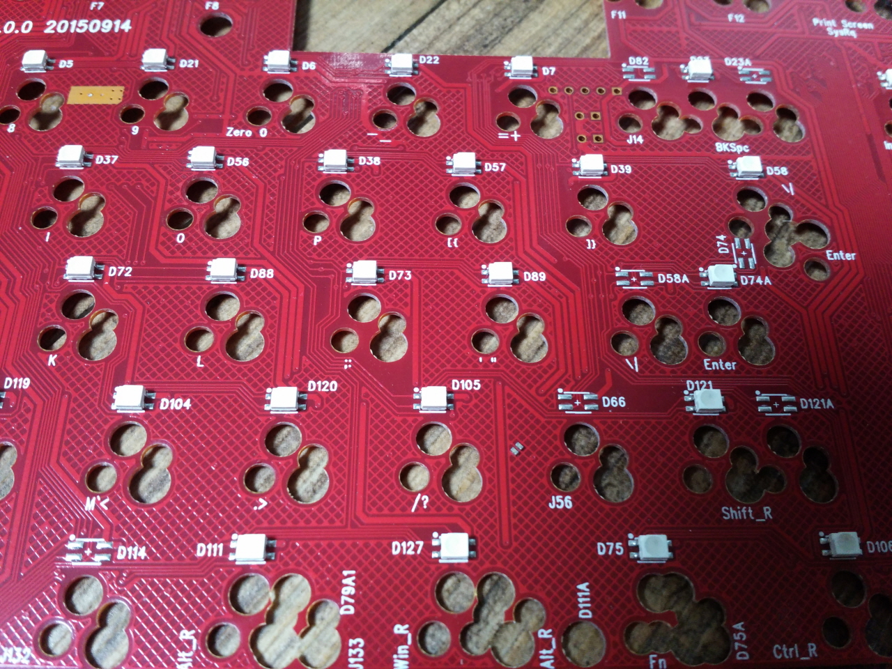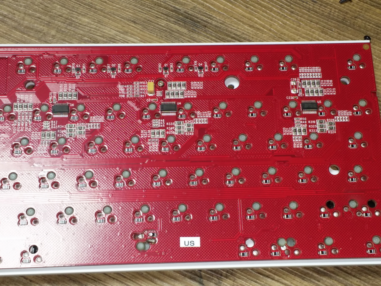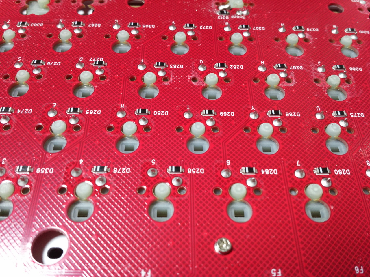 캡스락과 스페이스바의 칩 LED는 밖으로 발광 할 수 있도록 보강판 쪽에 구멍이 뚫어져 있습니다.