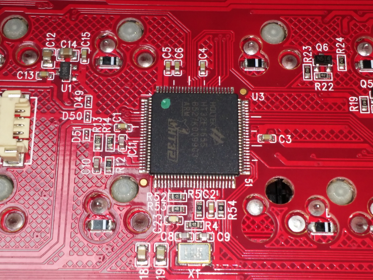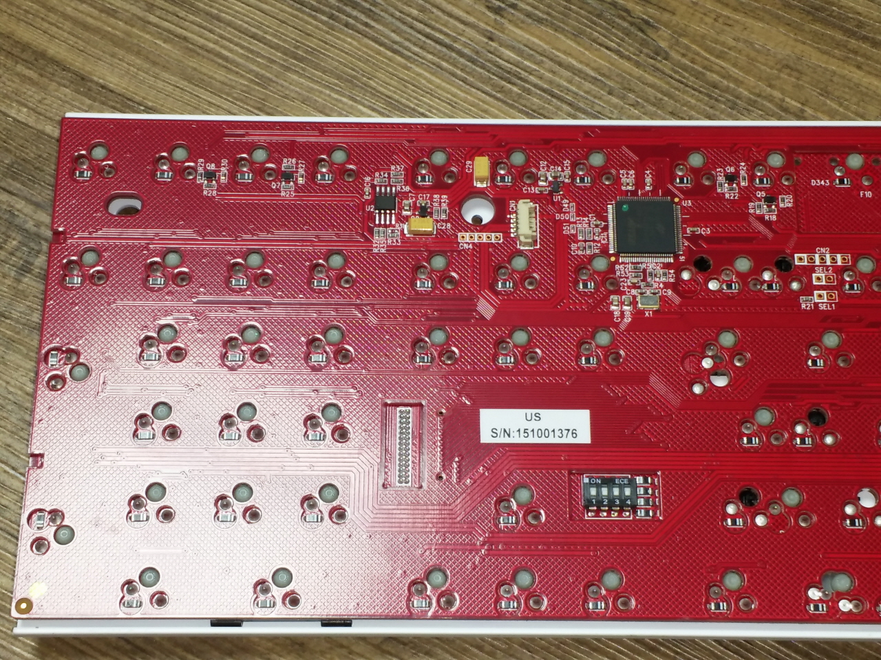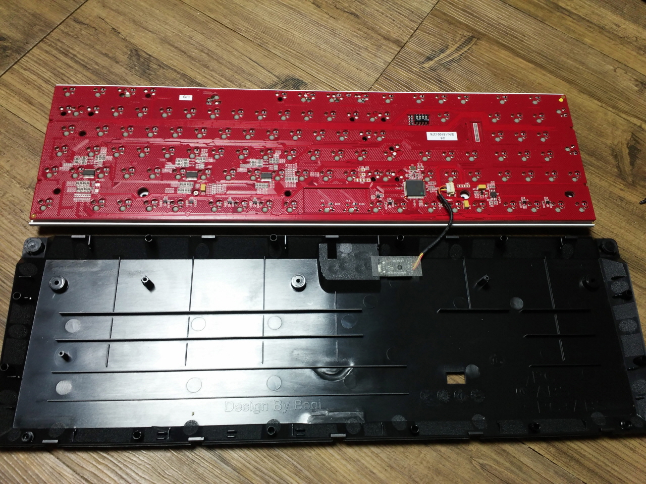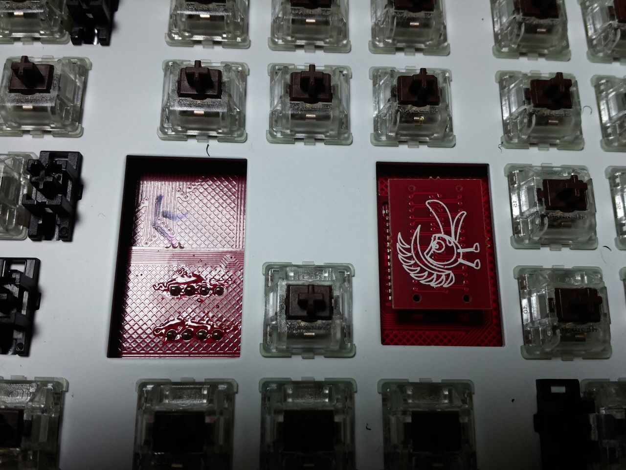 더키 로고가 있는 저 작은 기판은 스위치가 박힌 기판과 칩 LED와 MCU가 실장 된 기판을 연결하는 역할을 합니다.