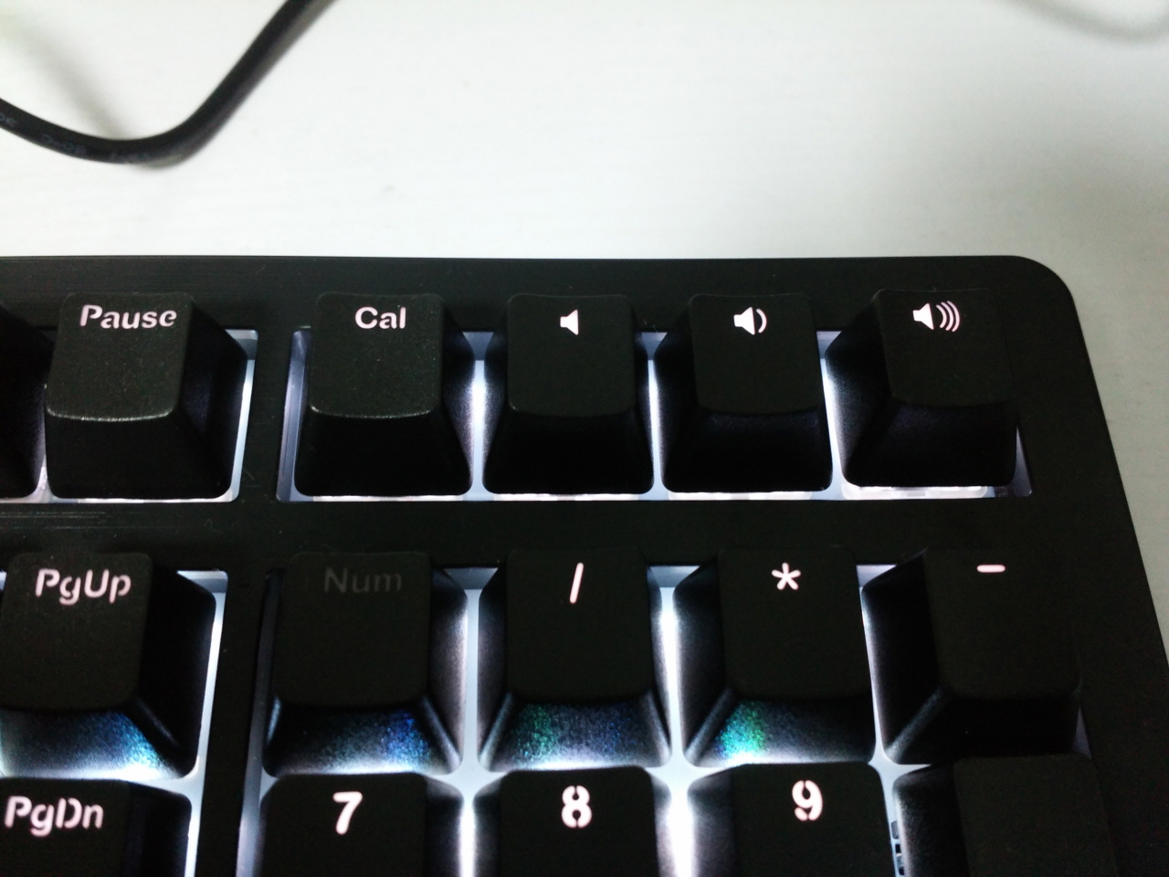 윈도우 키가 있는 풀 사이즈 US Layout이면 일반적으로 104키를 생각하게 되는데, 더키 키보드는 넘버패드 윗 공간에 4 개의 추가 기능키를 채웠습니다. 순서대로 계산기, 음소거, 음량 감소, 음량 증가 의 기능을 갖고 있습니다. 총 108키의 풀배열 키보드 입니다.