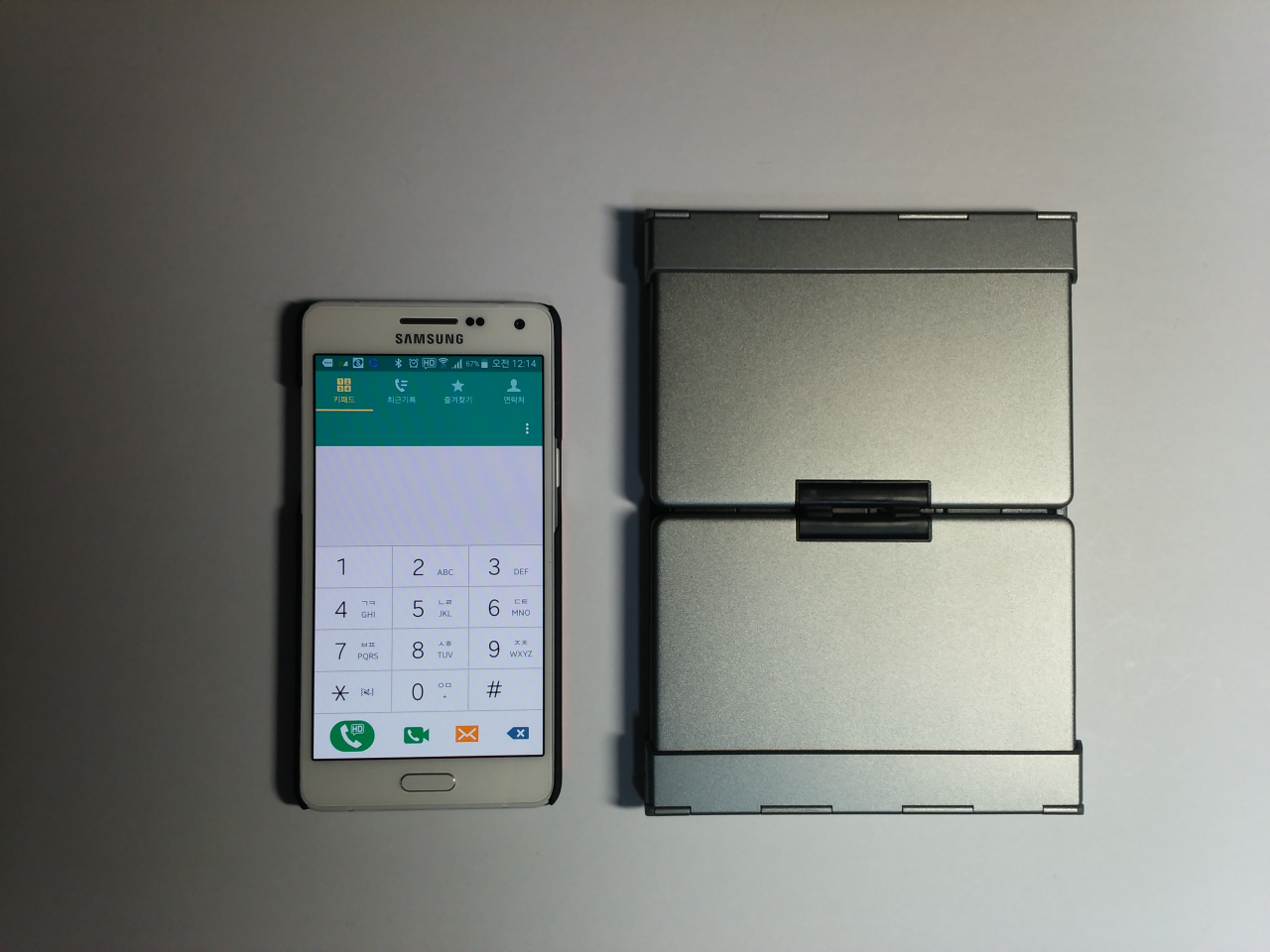 키보드를 접을 때의 모습 입니다. 큰 이질감 없이 폴딩이 되며, 접히는 부분에 위치한 경첩이 겉은 단단하지만 움직임은 부드러워서 키보드를 여닫을때의 느낌이 좋습니다.