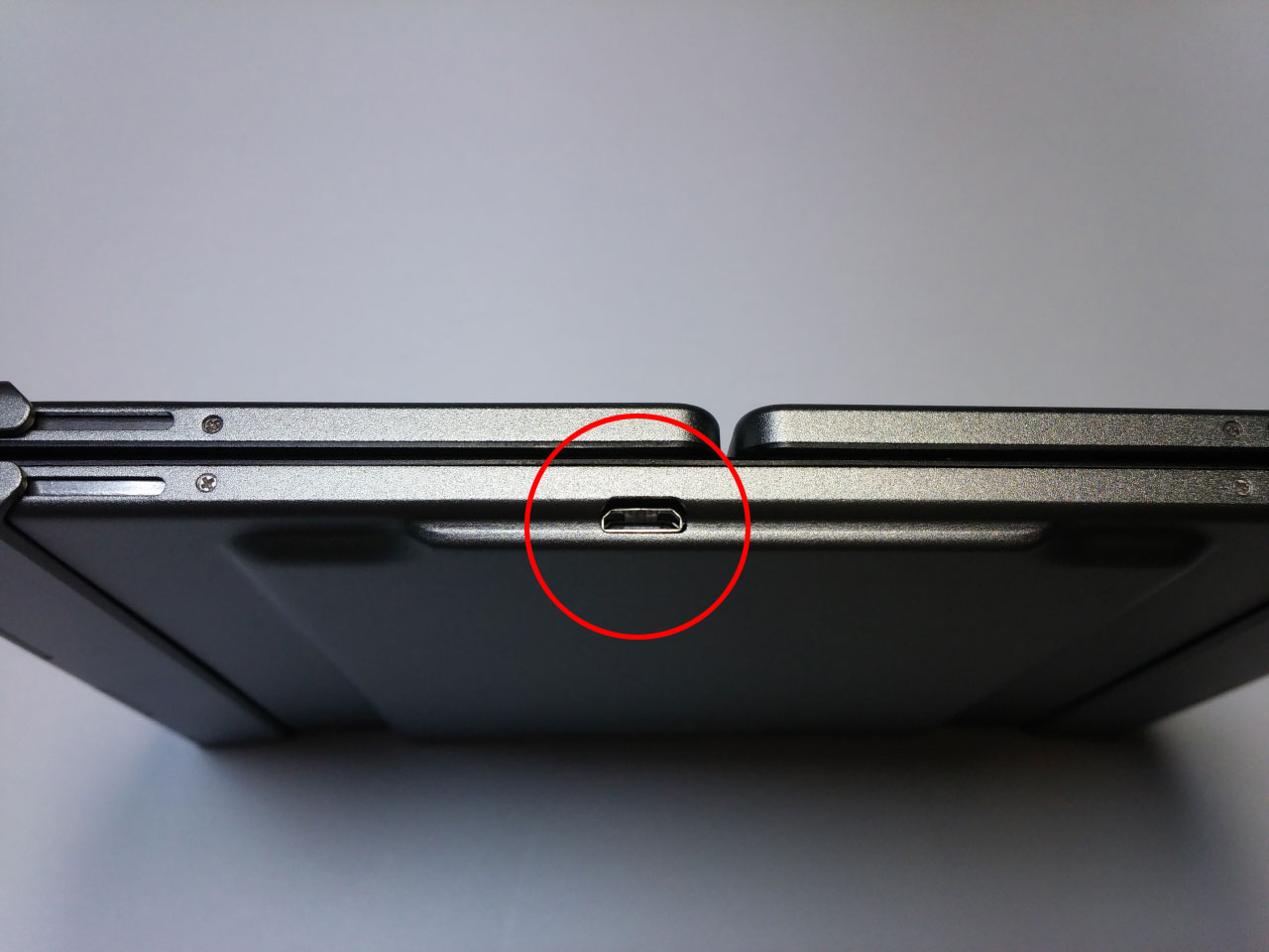 위에서 제품을 바라본 모습입니다. 좌우로 키보드를 접을 때 사용되는 경첩 부분이 있고 가운데는 충전을 위한 USB 포트가 위치하고 있습니다. 키보드를 여닫는 부분은 자석으로 처리되어 접었을 때 단단하게 고정이 됩니다.