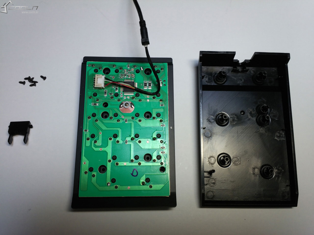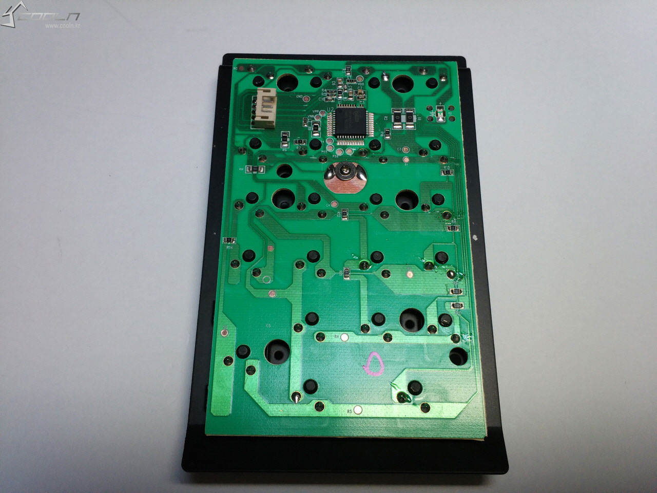 상판과 PCB의 뒷 면의 모습 입니다. 컨트롤러와 케이블 연결을 위한 소켓 등을 볼 수 있습니다.