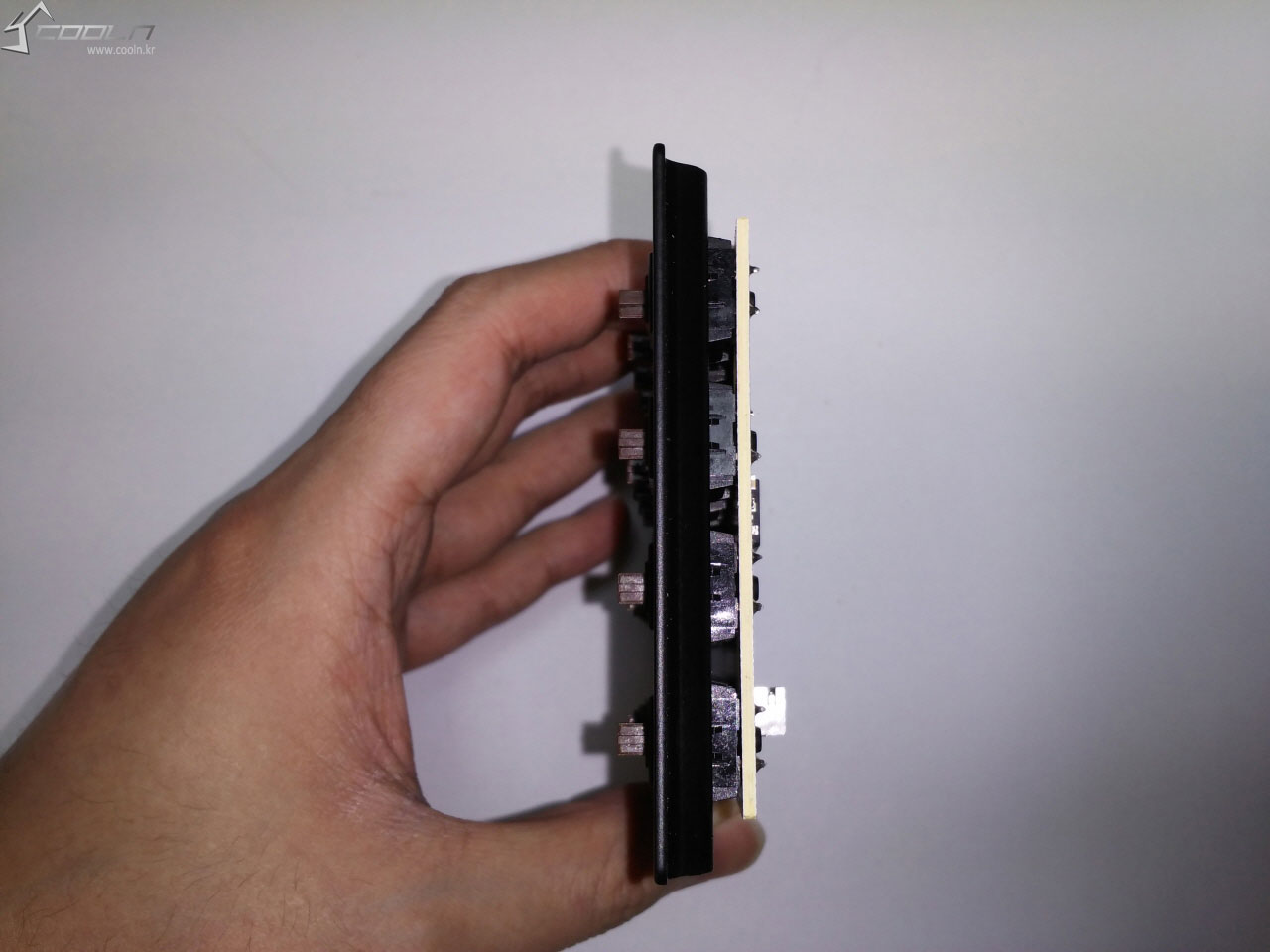 키패드의 측면 모습 입니다. 스탭스컬쳐2가 적용되어 있으며 상판이 스위치 보강판을 역할을 하고 있는 비키 타입 하우징임을 알 수 있습니다.