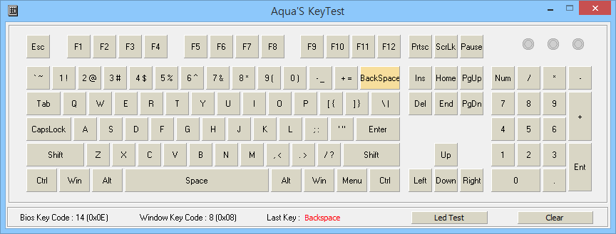 키 테스트 프로그램으로 확인 한 결과 탭 키와 백 스페이스 키의 경우는 문제가 없는 것 같은데, 양쪽 괄호와 등호 키는 이해 할 수 없는 동작이 되었습니다. 하지만 화면 출력에는 문제가 없었습니다.