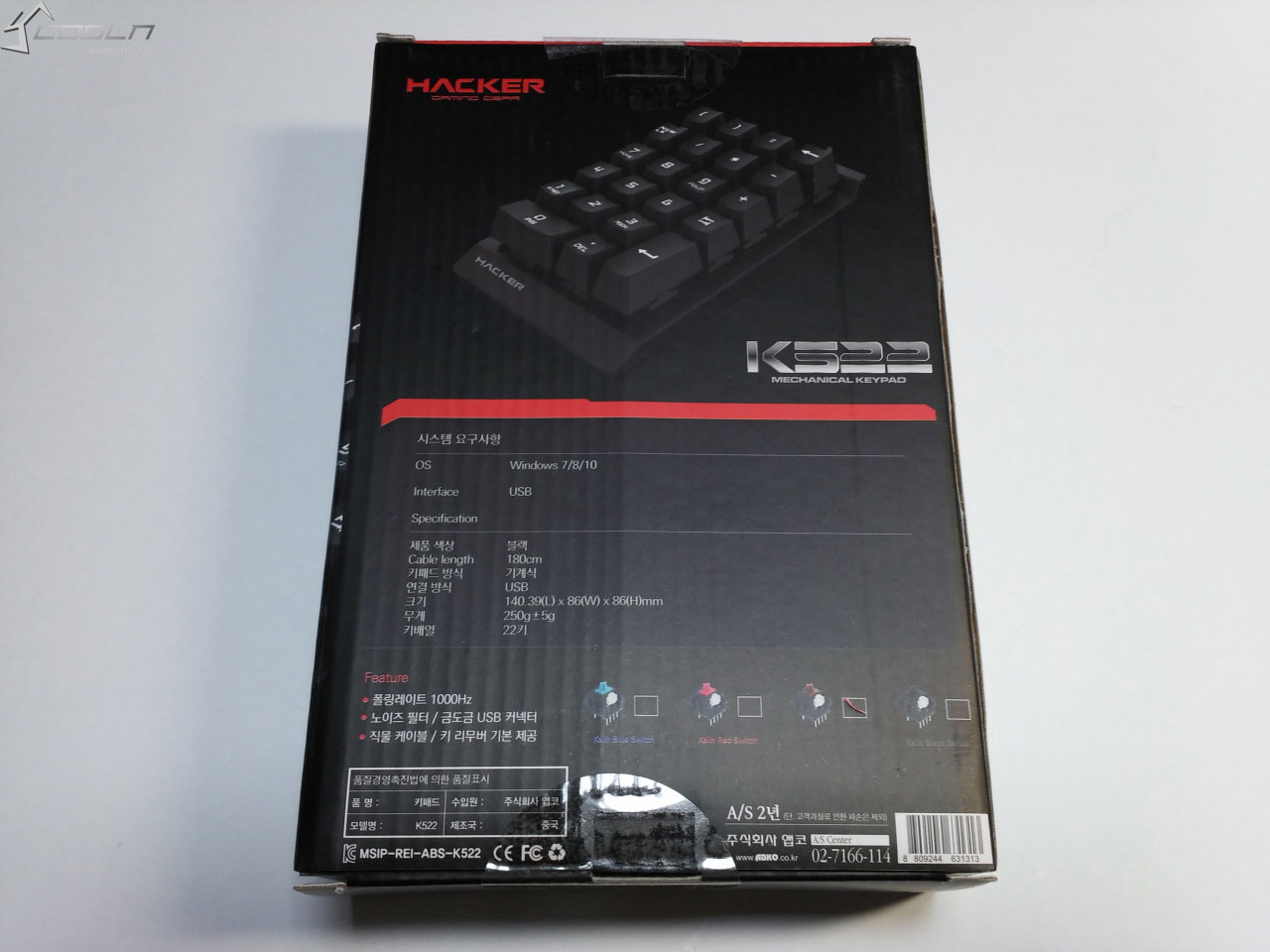 후면의 모습 입니다. 제품의 스펙과 특징이 기재되어 있습니다. 제가 수령한 제품은 갈축 입니다.