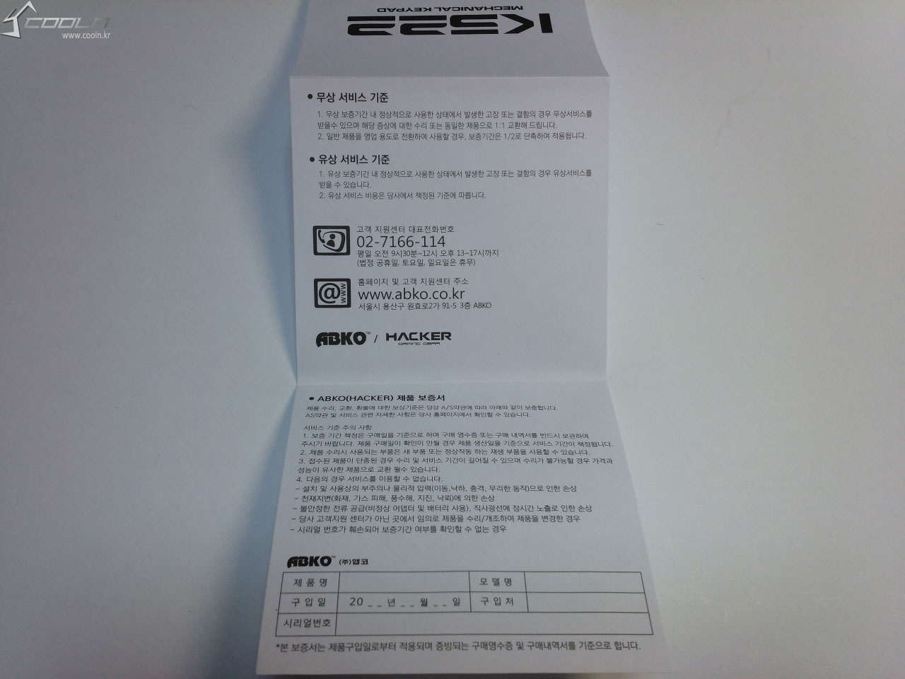 키패드 외 구성품으로는 제품 보증서와 키캡 리무버가 있습니다.