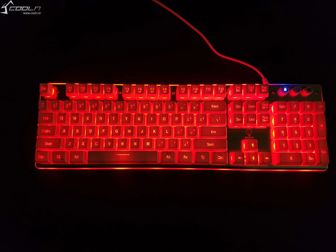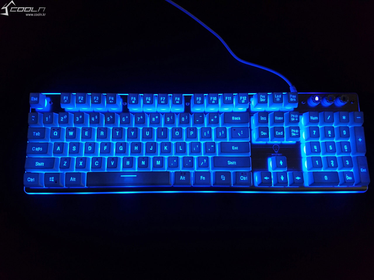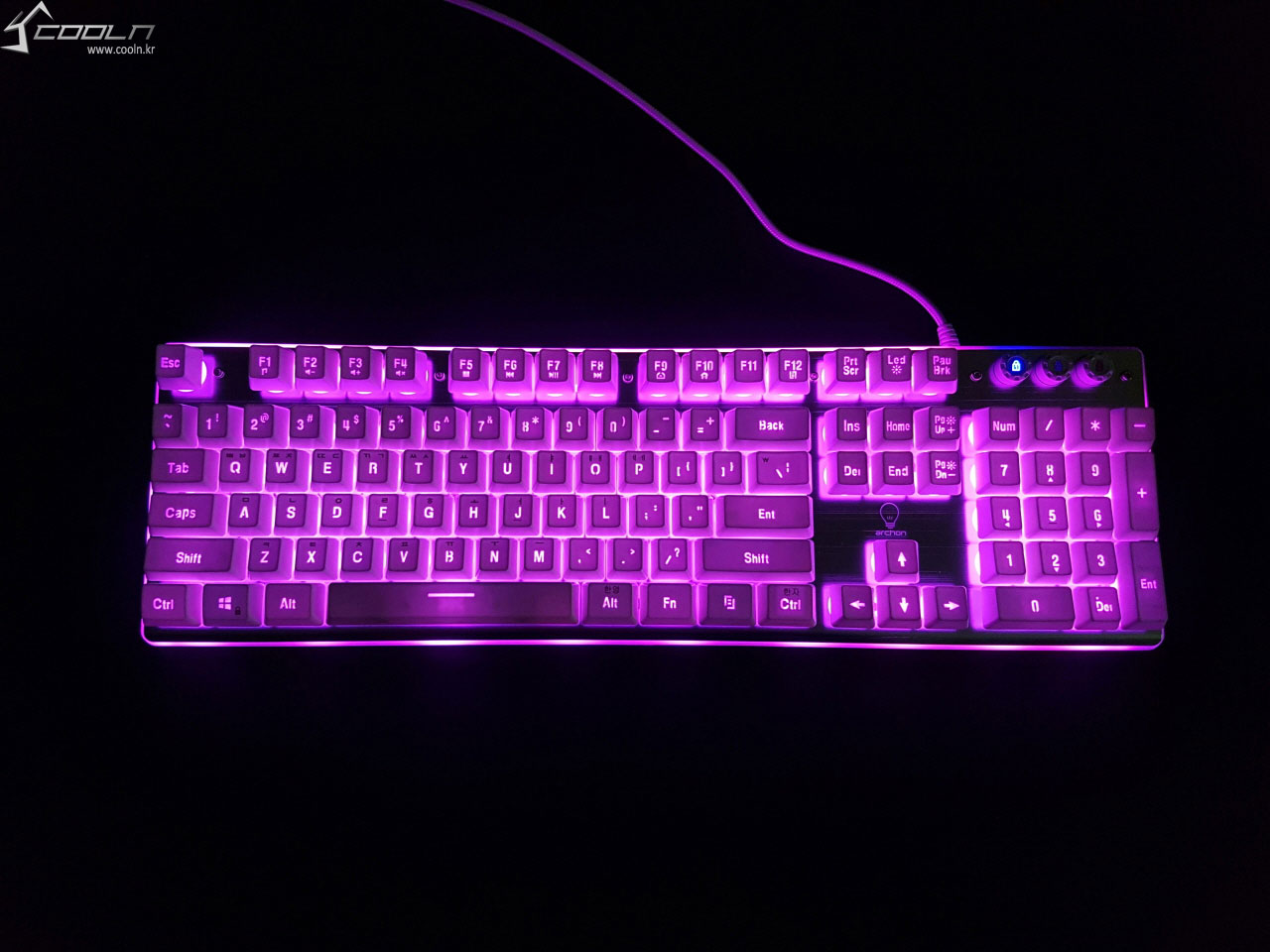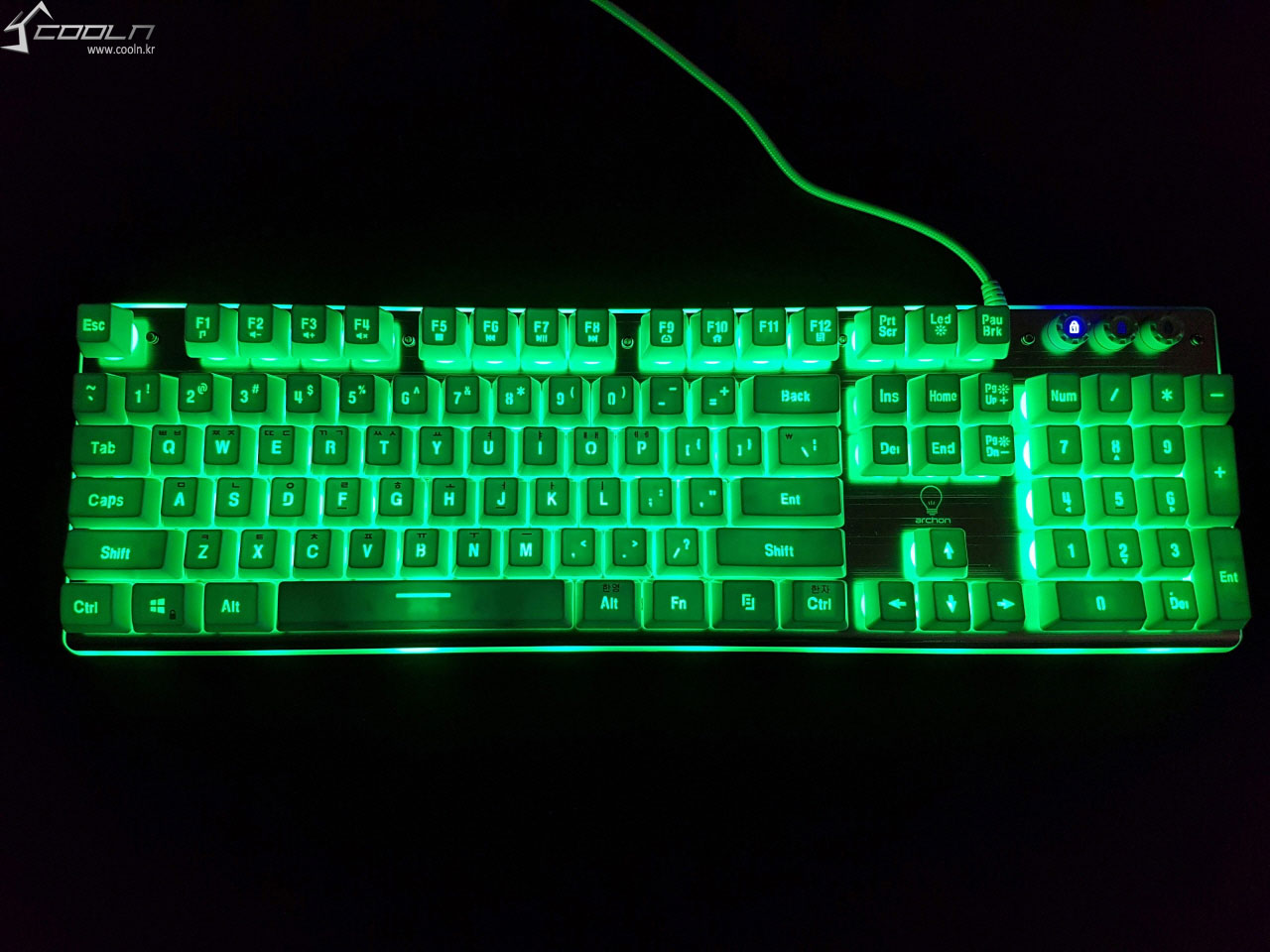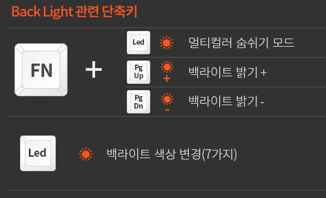 우측 상단의 LED 키로 색상(단색)을 변경 할 수 있으며, FN + LED 키는 멀티 컬러 숨쉬기 모드 입니다.