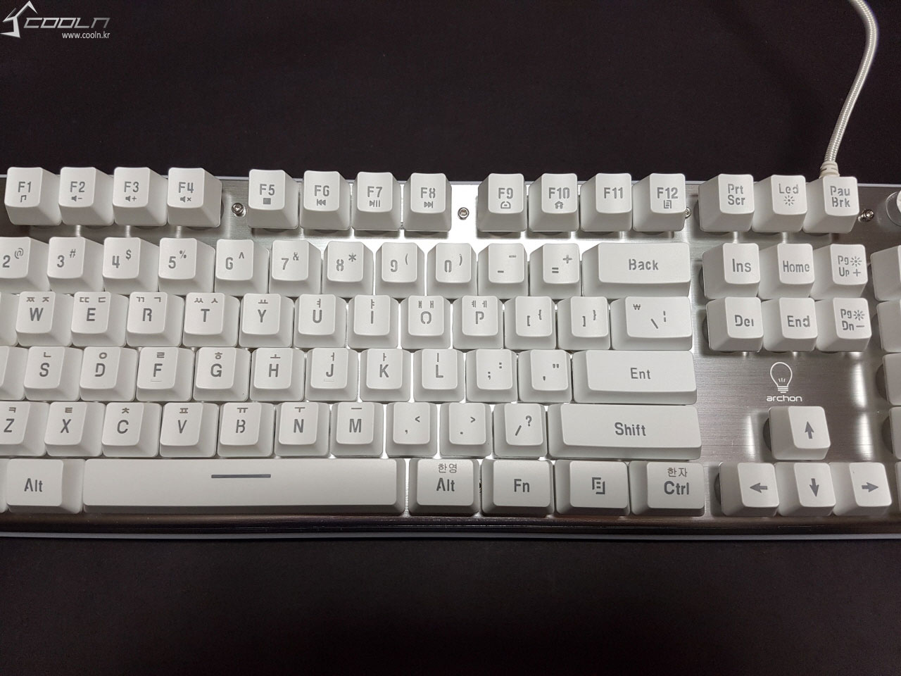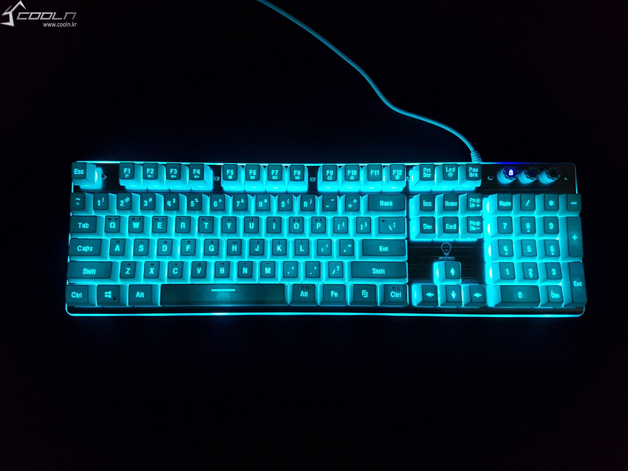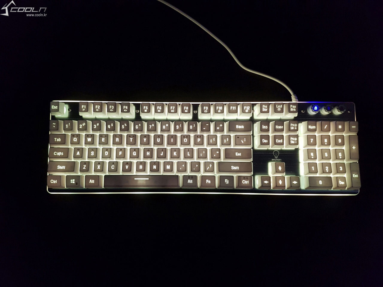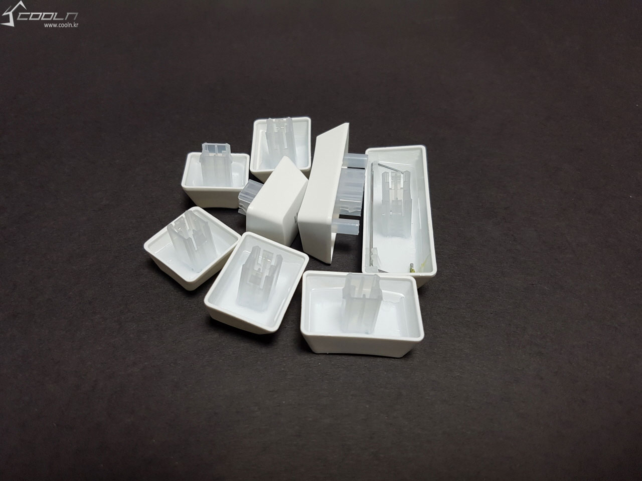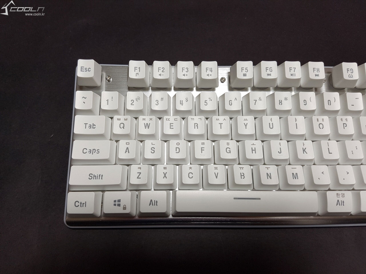 LED용 이중사출 키캡을 사용하였으며, 한글 부분은 레이저 프린트로 각인이 되어 있습니다. 영문 폰트의 경우 동급의 타사 키보드에서도 많이 볼 수 있는 각인으로 독창적인 폰트를 사용하였으면 좀 더 어필이 되지 않았을까 하는 아쉬움도 있습니다.