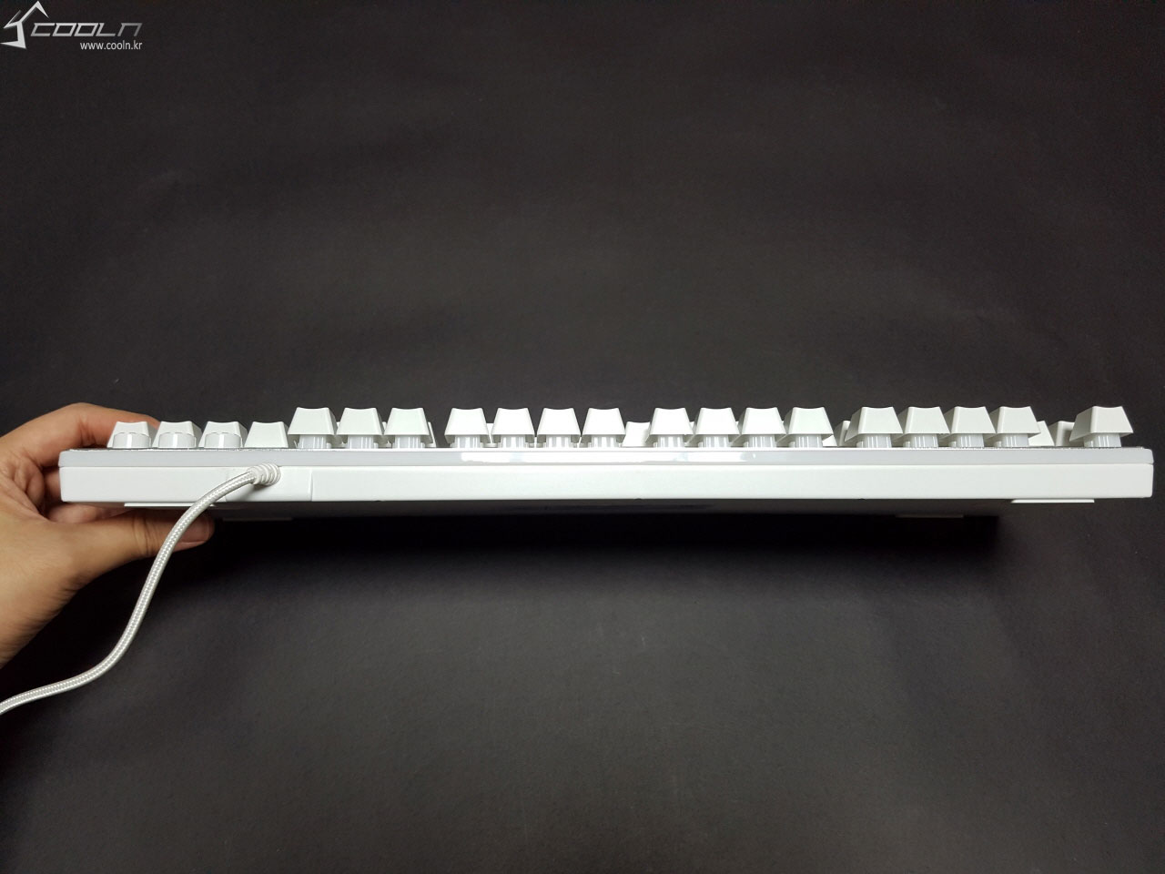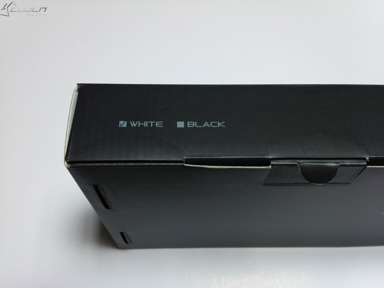 박스의 측면으로 제품명이 프린트 되어 있으며 좌측에 키보드의 색상이 표기 되어 있습니다. 제가 수령한 제품은 화이트 색상 입니다.