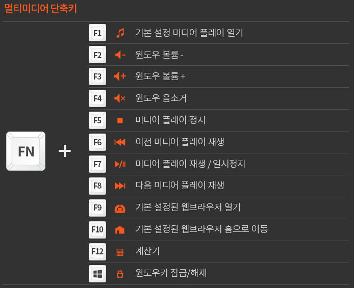 FN키와 펑션열 키(F1~F12)의 조합으로 멀티미디어 단축키 기능을 지원 하고 있습니다.