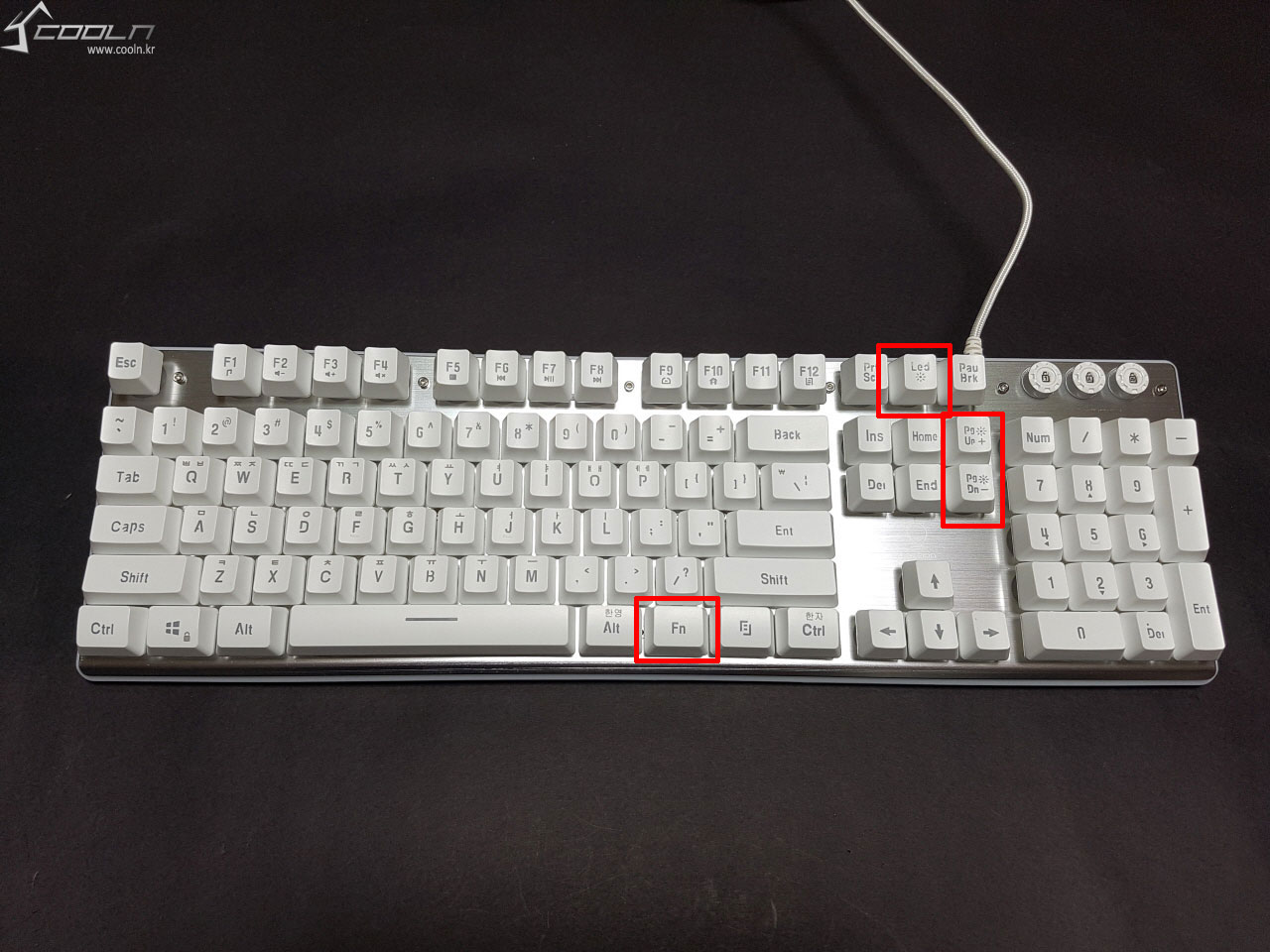 FN + PageUp, FN + PageDown 키 조합을 이용하여 LED의 밝기를 조절할 수 있습니다.