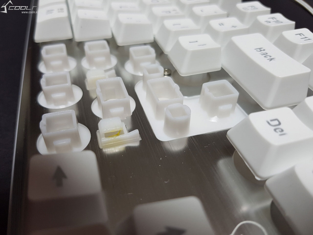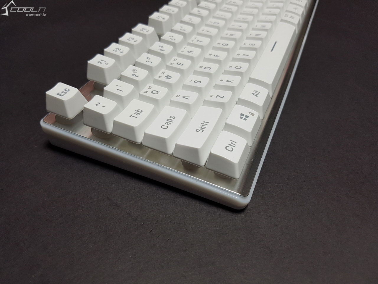 LED용 이중사출 키캡을 사용하였으며, 한글 부분은 레이저 프린트로 각인이 되어 있습니다. 영문 폰트의 경우 동급의 타사 키보드에서도 많이 볼 수 있는 각인으로 독창적인 폰트를 사용하였으면 좀 더 어필이 되지 않았을까 하는 아쉬움도 있습니다.