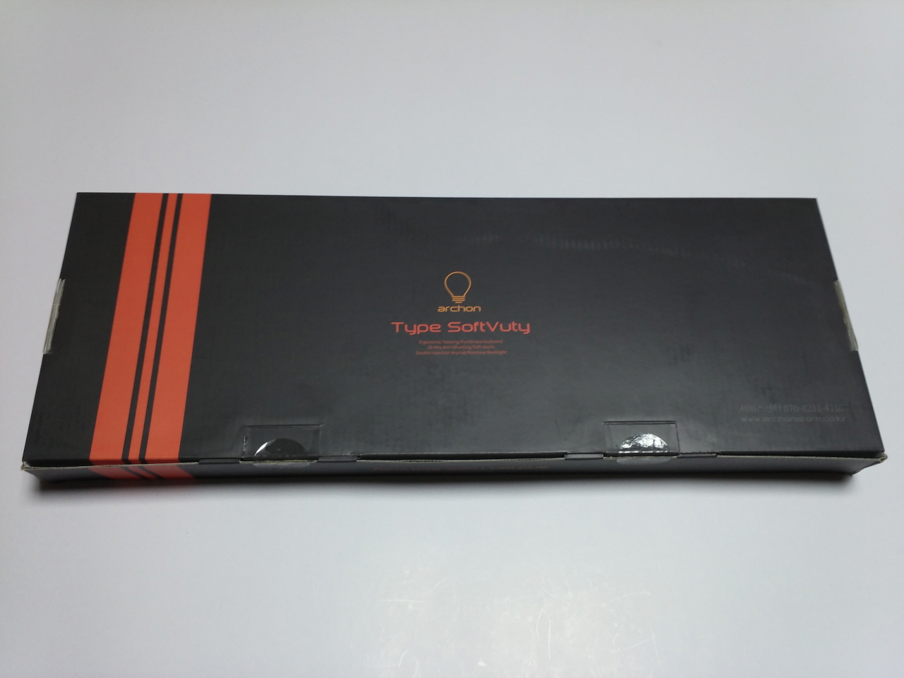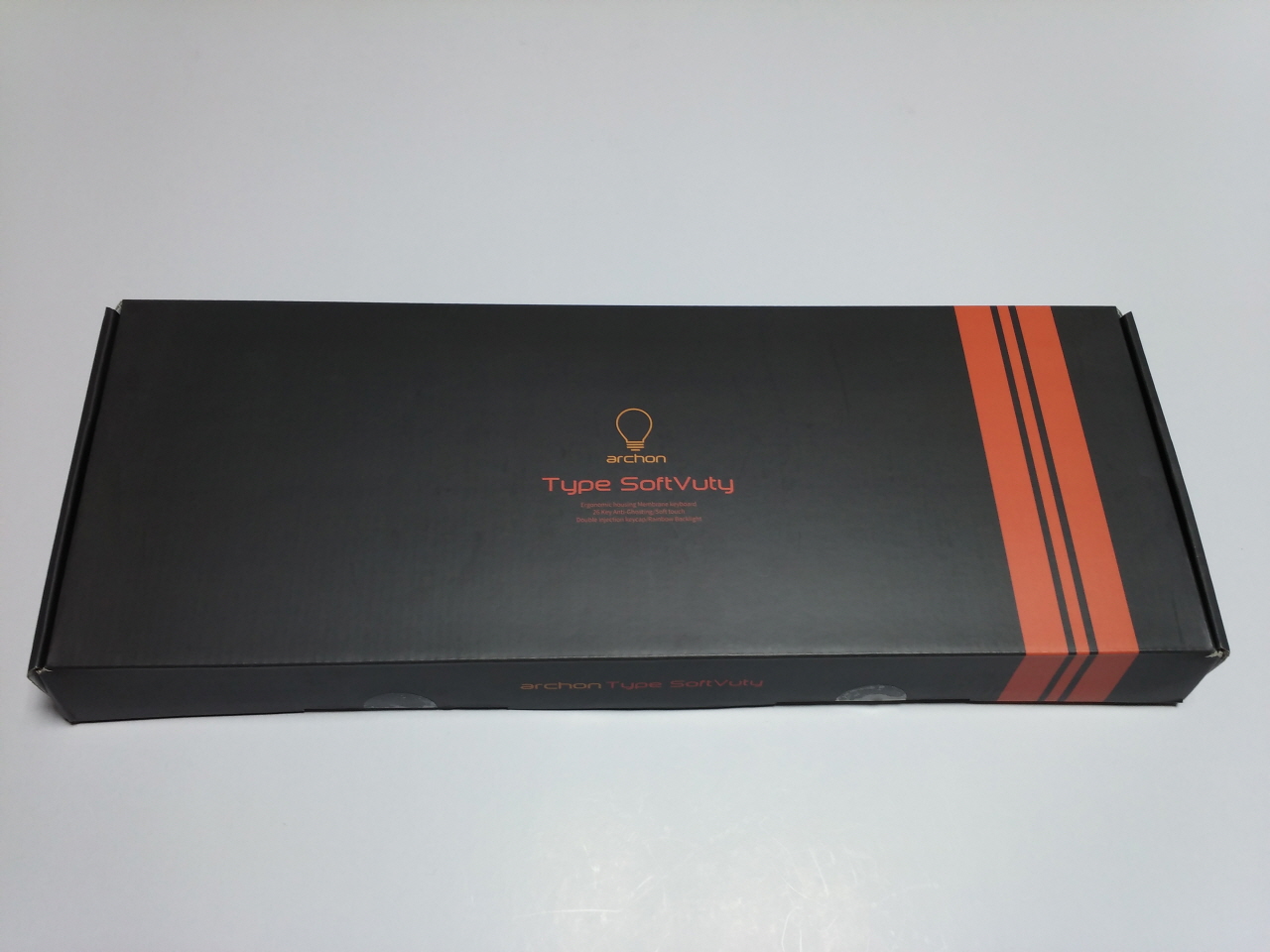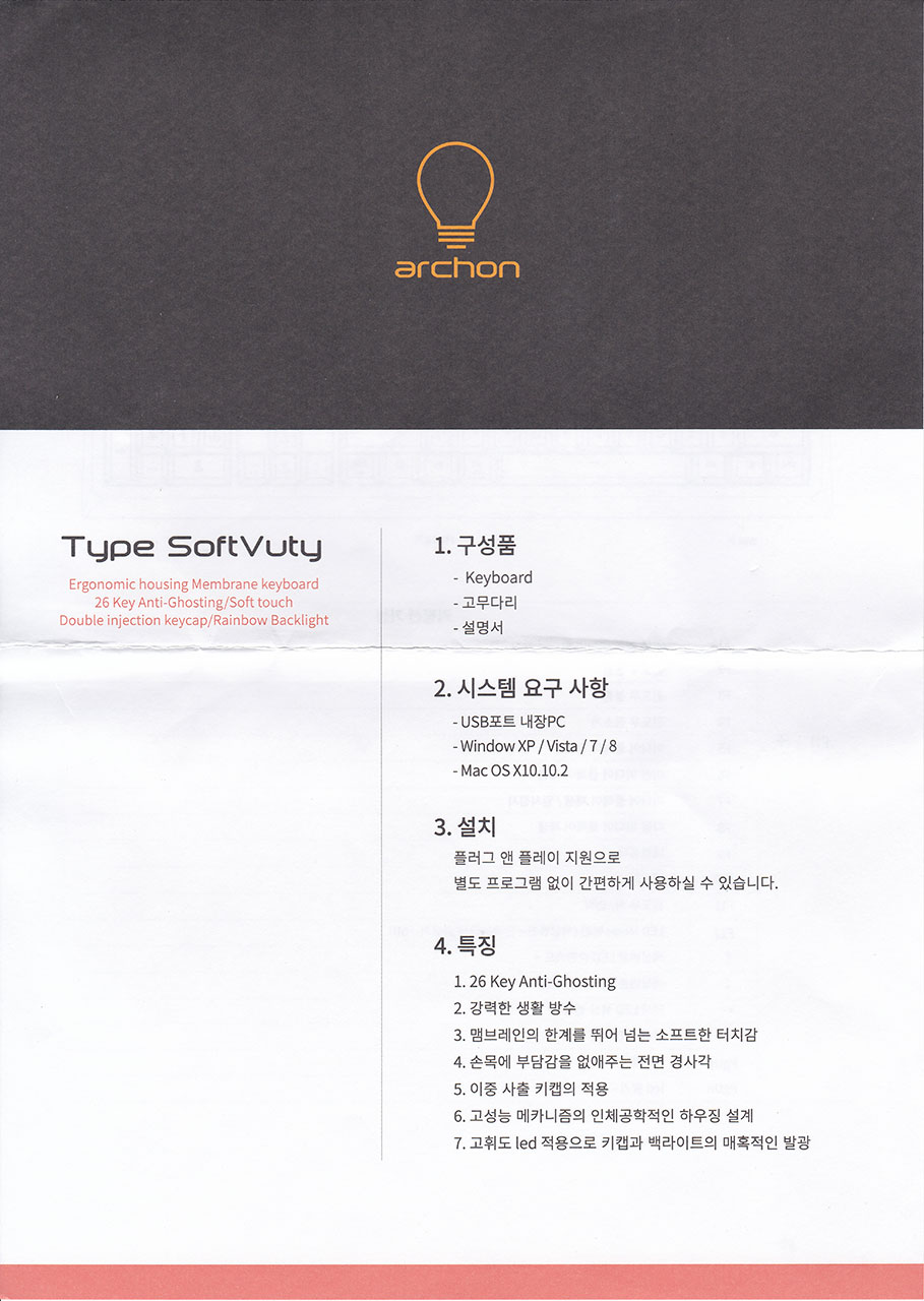 전면 박스의 모습 입니다. archon의 로고인 전구 모양 그림과 아래에는 제품명인 Type SoftVuty 글자가 프린트 되어 있습니다.