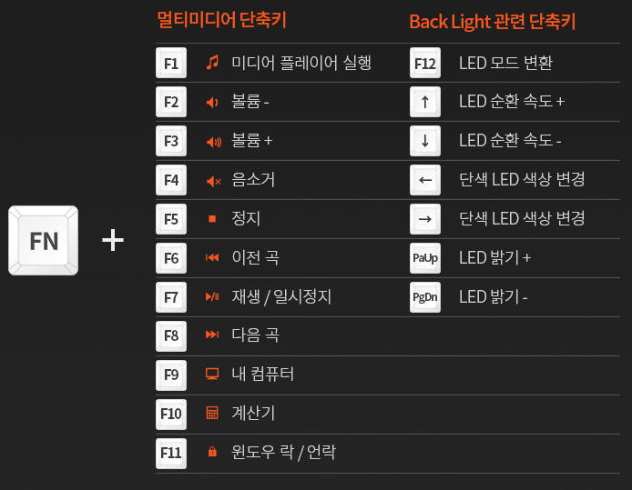 FN키와 펑션열 키(F1~F12)의 조합으로 멀티미디어 단축키 기능을 지원 하고 있습니다. FN키를 조합하여 미디어플레이어, 내 컴퓨터, 계산기 프로그램을 실행할 수 있었습니다. 다만 윈도우키 잠금 기능의 경우 잠금 상태인지 아닌지를 알 수 있는 LED가 없기 때문에 조금 불편한 점은 있는 것 같습니다.