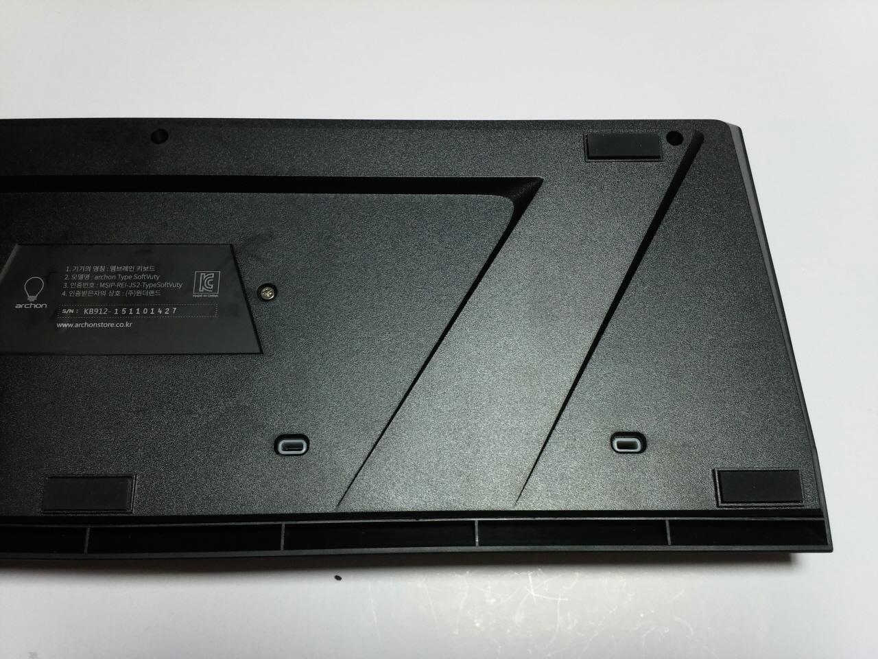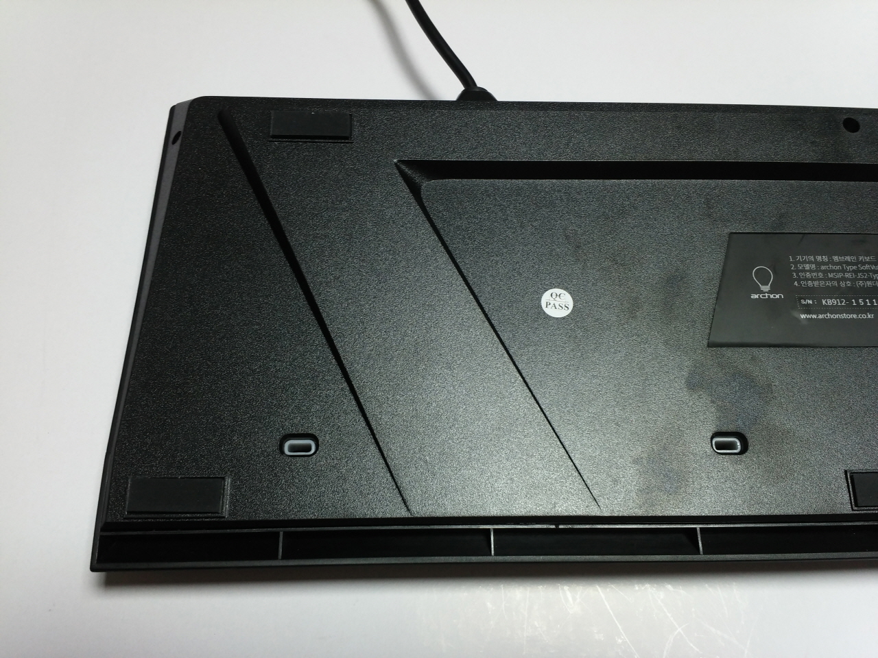 SoftVuty의 후면 모습 으로, 타건 시 키보드가 밀리는 것을 방지하기 위한 고무 패드가 있는 것을 볼 수 있습니다.