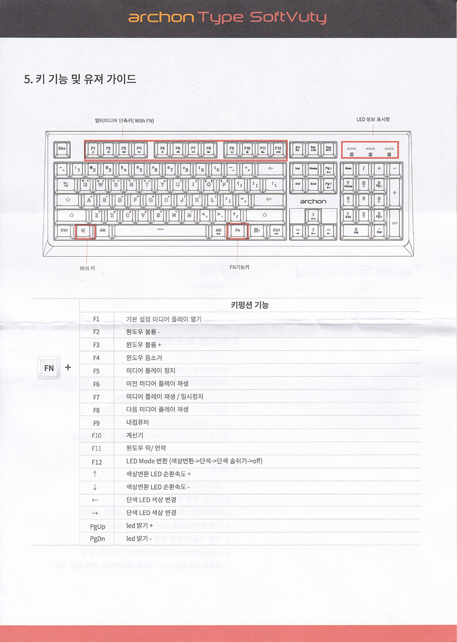 FN키와 펑션열 키(F1~F12)의 조합으로 멀티미디어 단축키 기능을 지원 하고 있습니다. FN키를 조합하여 미디어플레이어, 내 컴퓨터, 계산기 프로그램을 실행할 수 있었습니다. 다만 윈도우키 잠금 기능의 경우 잠금 상태인지 아닌지를 알 수 있는 LED가 없기 때문에 조금 불편한 점은 있는 것 같습니다.