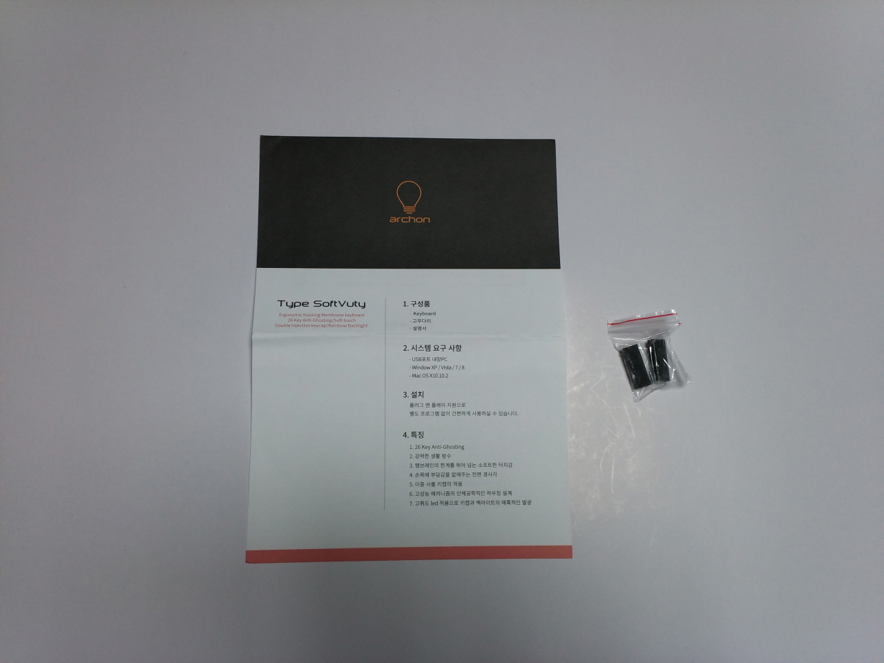 키보드 외 구성품으로는 사용설명서와 높이 조절을 위한 5mm 높이의 고무 패드를 추가로 제공 하고 있습니다.