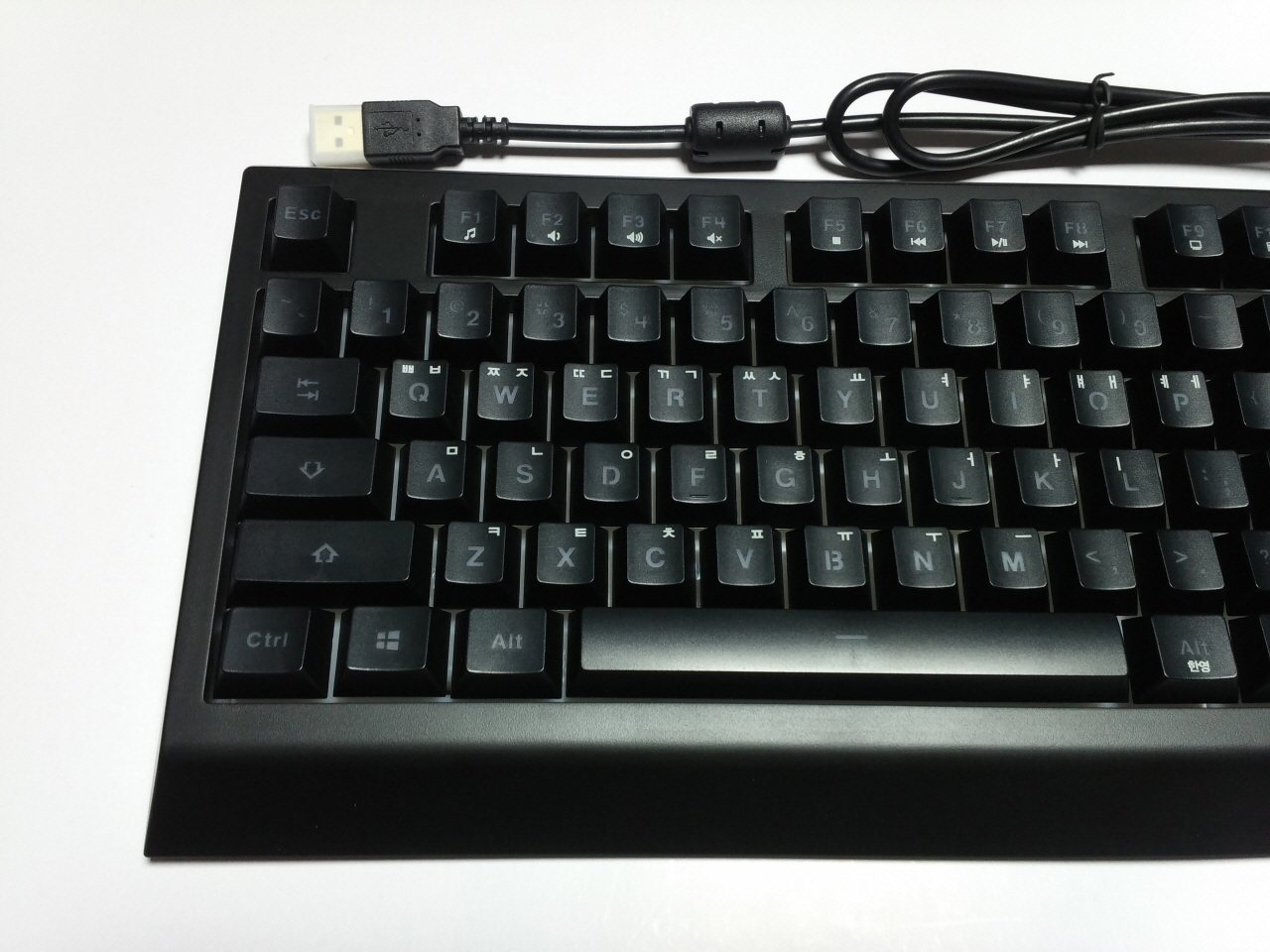 키캡은 이중 사출 방식이며, 한글 각인은 레이저 인쇄 입니다. 키캡의 촉감은 약간 미끄러운 느낌이 들었습니다.