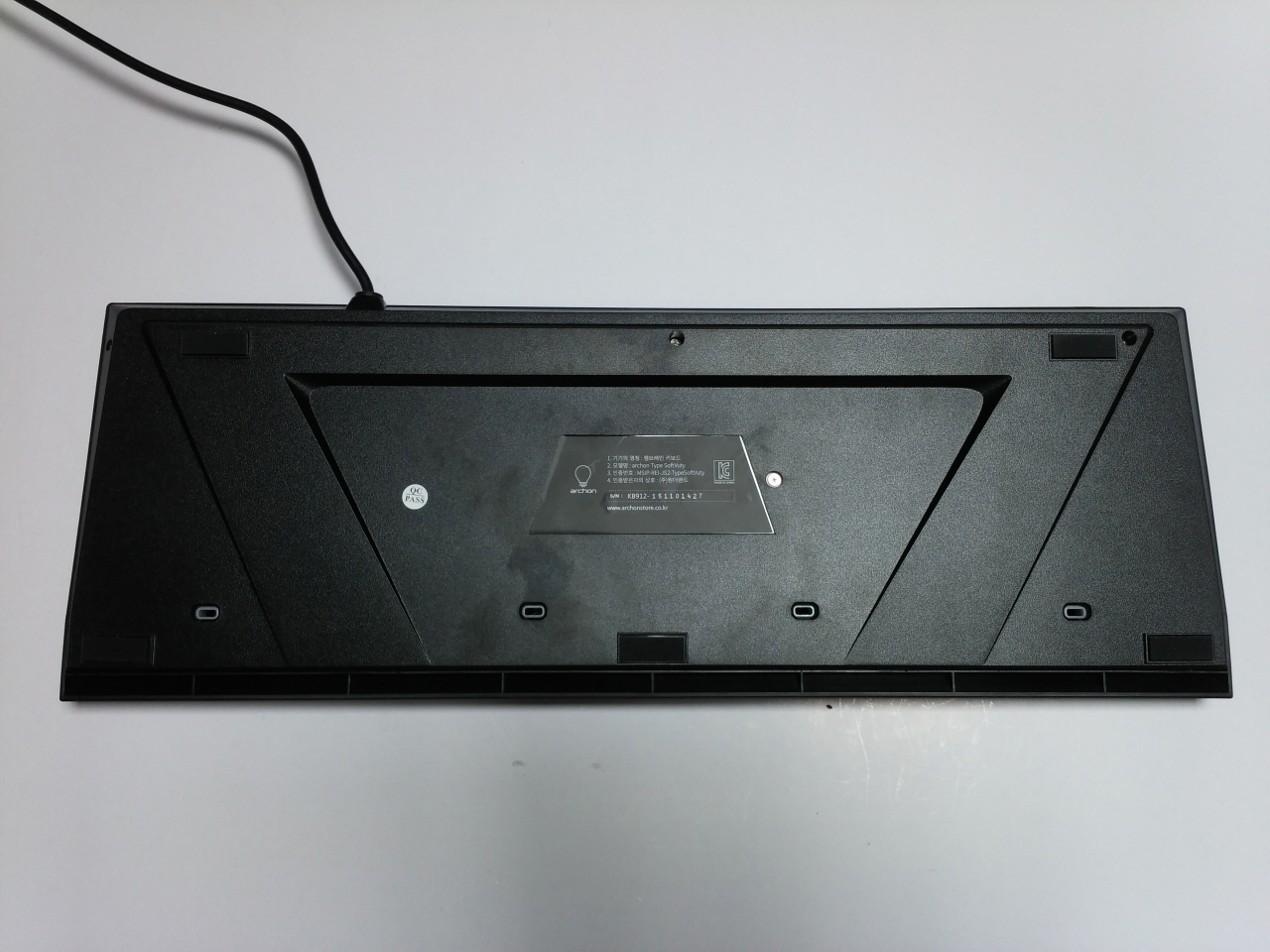 SoftVuty의 후면 모습 으로, 타건 시 키보드가 밀리는 것을 방지하기 위한 고무 패드가 있는 것을 볼 수 있습니다.