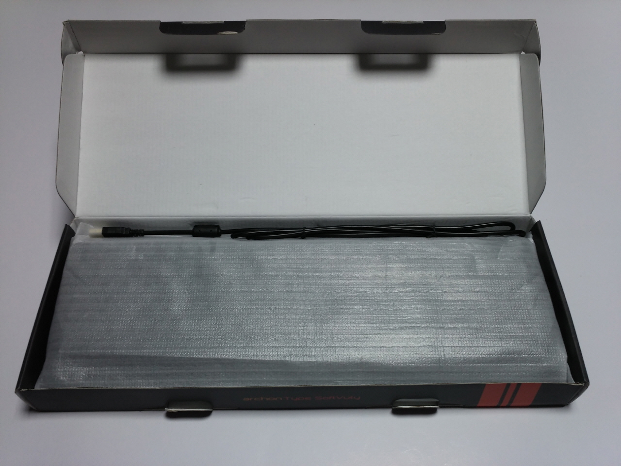 전면 박스의 모습 입니다. archon의 로고인 전구 모양 그림과 아래에는 제품명인 Type SoftVuty 글자가 프린트 되어 있습니다.