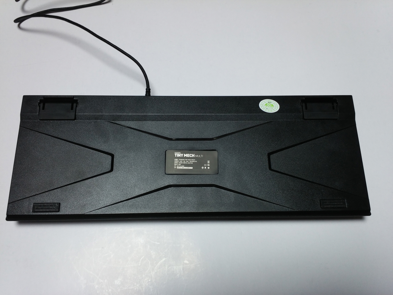 후면의 모습으로 제품 라벨과 타건 시 키보드가 밀리는 것을 방지하는 고무패드, 높낮이 조절 다리가 있는 것을 볼 수 있습니다.