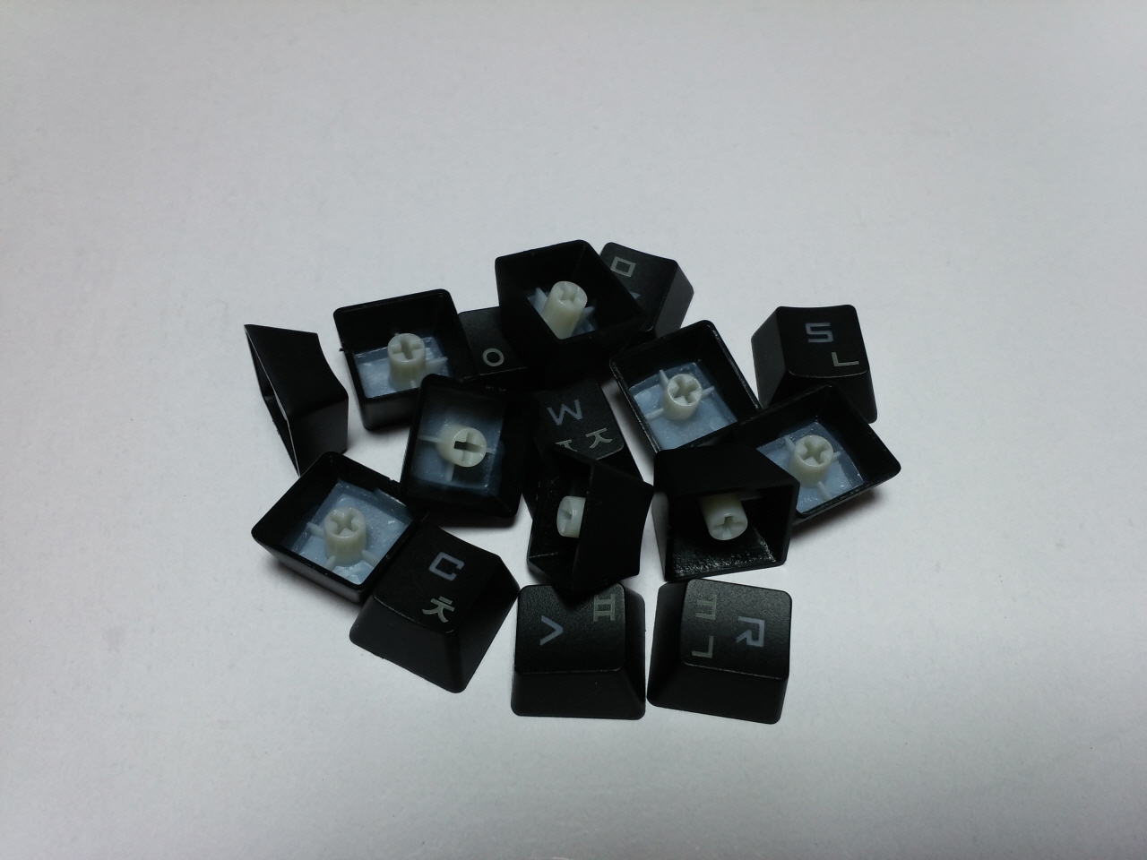 키캡은 LED 효과를 위한 이중사출 방식으로 제작이 되었으며 한글 각인 및 FN 키 조합으로 수행 되는 키에 대한 각인은 레이저 인쇄 방식이 사용 되었습니다.