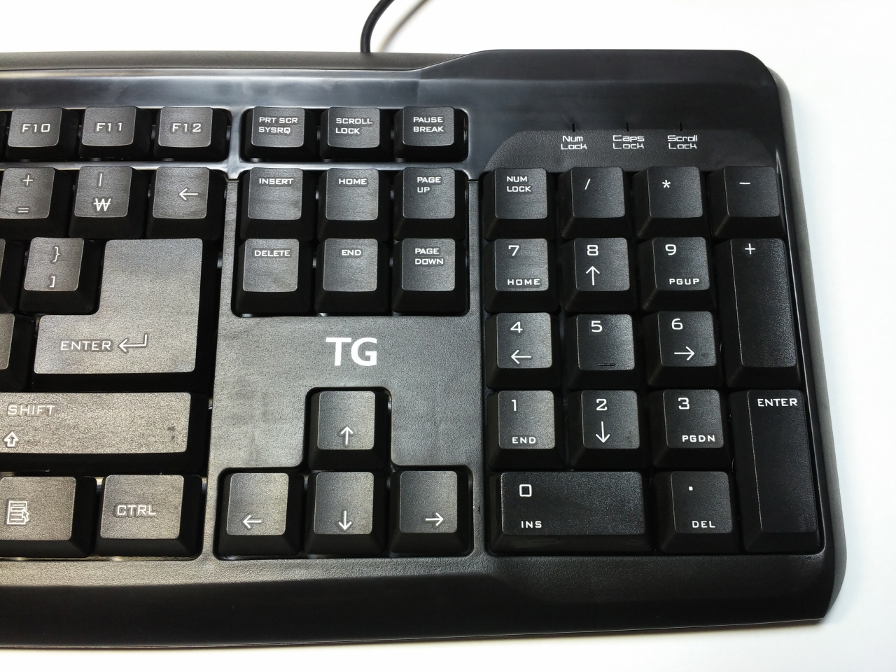우측에는 윈도우키가 없는 것을 볼 수 있습니다. 방향키 위에는 TG 로고가 프린트 되어 있습니다.