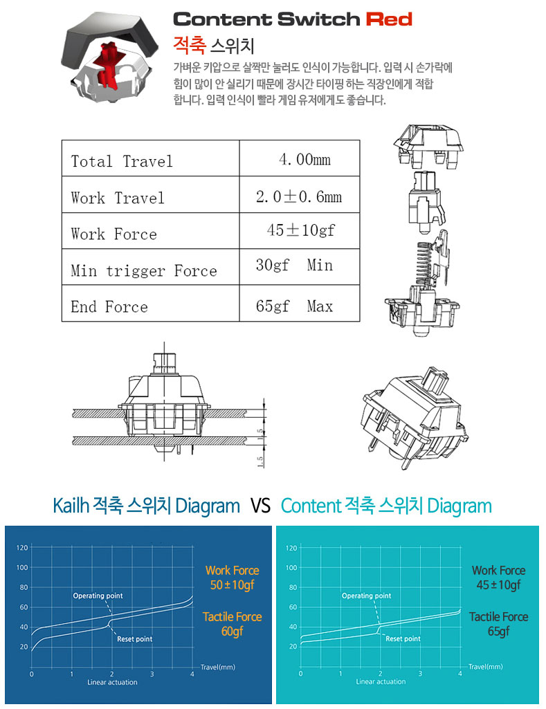 위의 그림은 공식 제품 설명에 기재 된 CONTENT 적축의 스펙과 기존의 CHERRY, KAILH, OUTEMU 스위치와 CONTENT 스위치를 수치 상으로 비교해 놓은 자료 입니다.