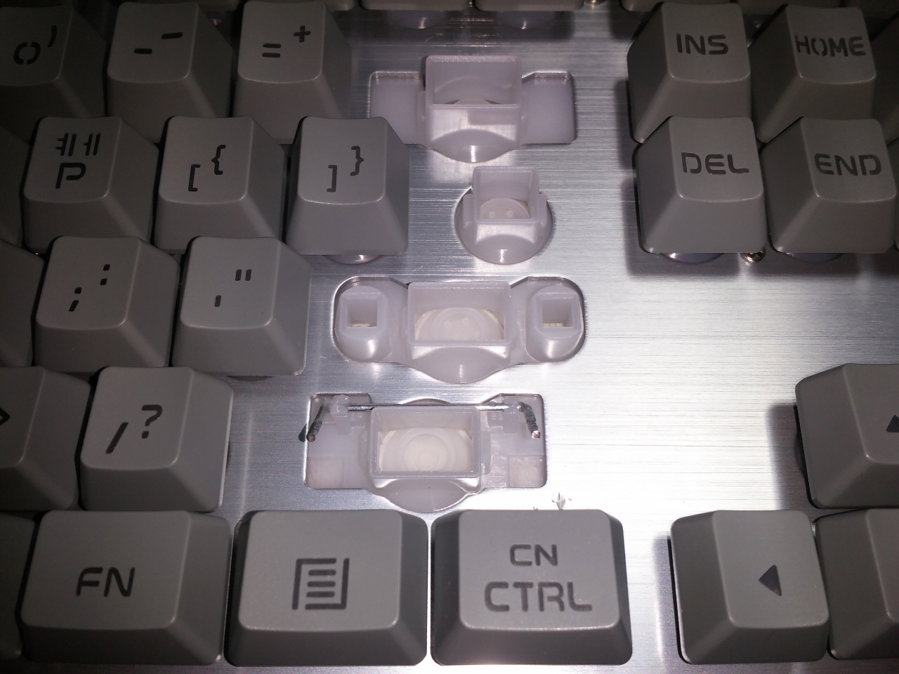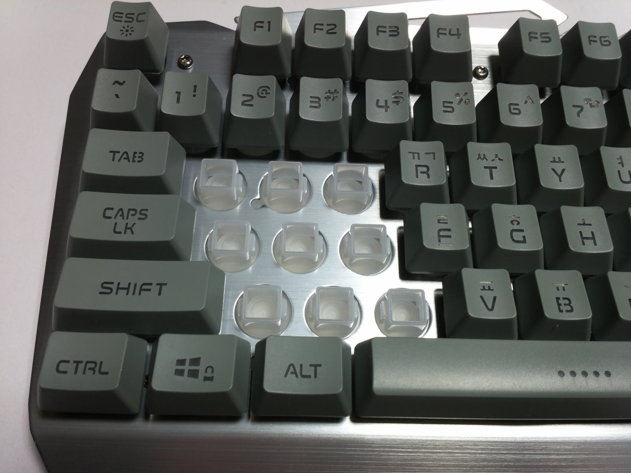 키캡을 뽑은 모습으로 키캡 체결 부분이 높게 솟아 있어서 기본적인 생활 방수에 대응할 수 있도록 설계가 되어 있음을 알 수 있습니다. 또한 LED 효과를 극대화 하기 위해 불투명의 플라스틱이 사용 된 것을 확인할 수 있었습니다.