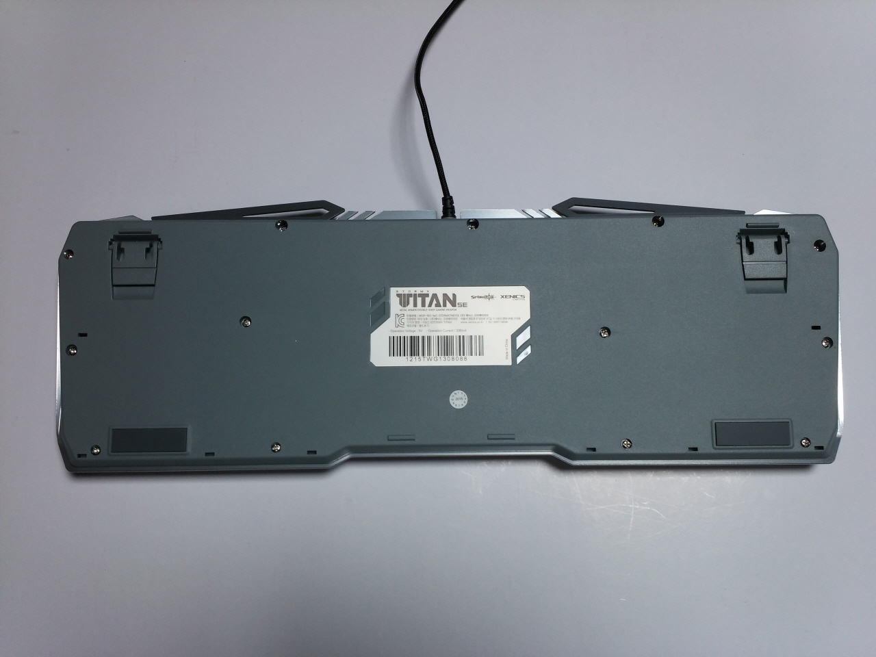 TITAN SE의 후면 모습 으로, 타건 시 키보드가 밀리는 것을 방지하기 위한 고무 패드와 높이 조절을 할 수 있는 다리가 위치하고 있습니다. 중앙에는 제품 라벨이 붙어 있는 것을 볼 수 있습니다.
