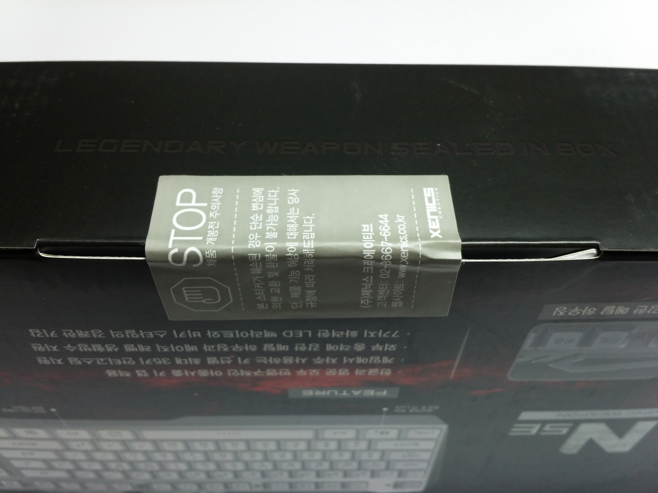 박스 측면의 모습으로 봉인용 스티커와 제품의 색상이 기재되어 있습니다. 중앙에 위치한 'LEGENDARY WEAPON SEALED IN BOX' 라는 문구가 이 키보드는 게이밍용 무기라는 느낌을 물씬 풍기게 합니다.
