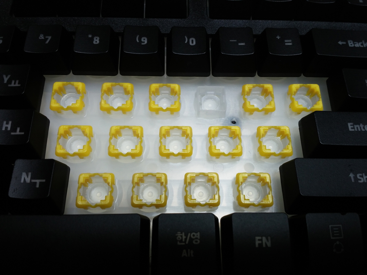 다이아몬드 링 구조물은 키 스트로크 시 키캡의 기둥 부분을 조금 더 잡아주어 타건 시 안정적이고 깔끔한 느낌이 들게하는 역할을 하고 있습니다. 다이아몬드 링 구조물이 없을 때 확실히 키캡이 상하좌우로 많이 흔들리는 모습을 볼 수 있었습니다. 다이아몬드 링이 있을 때와 없을 때의 차이 부분은 아래 동작 및 기능 파트에서 좀 더 자세히 살펴 보도록 하겠습니다.